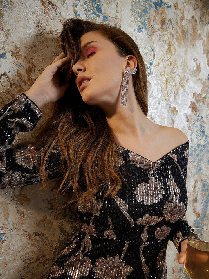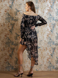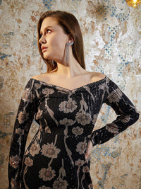 Athena Black Abstract Printed Off Shoulder Sequinned A-Line Dress