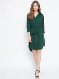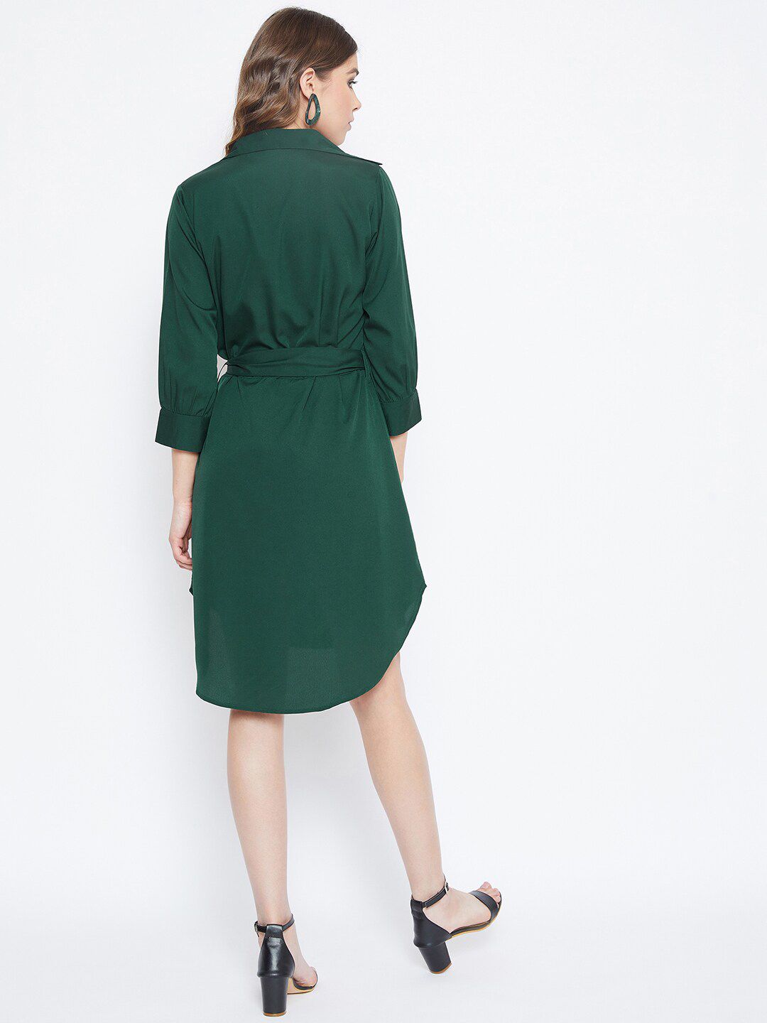 Green solid woven shirt dress, has a shirt collar, three-quarter sleeves, and curved hem
