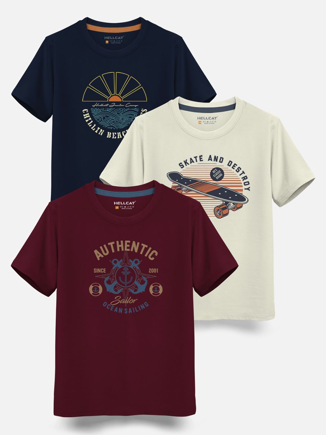 HELLCAT Boys Pack Of 3 Printed Cotton T-shirt