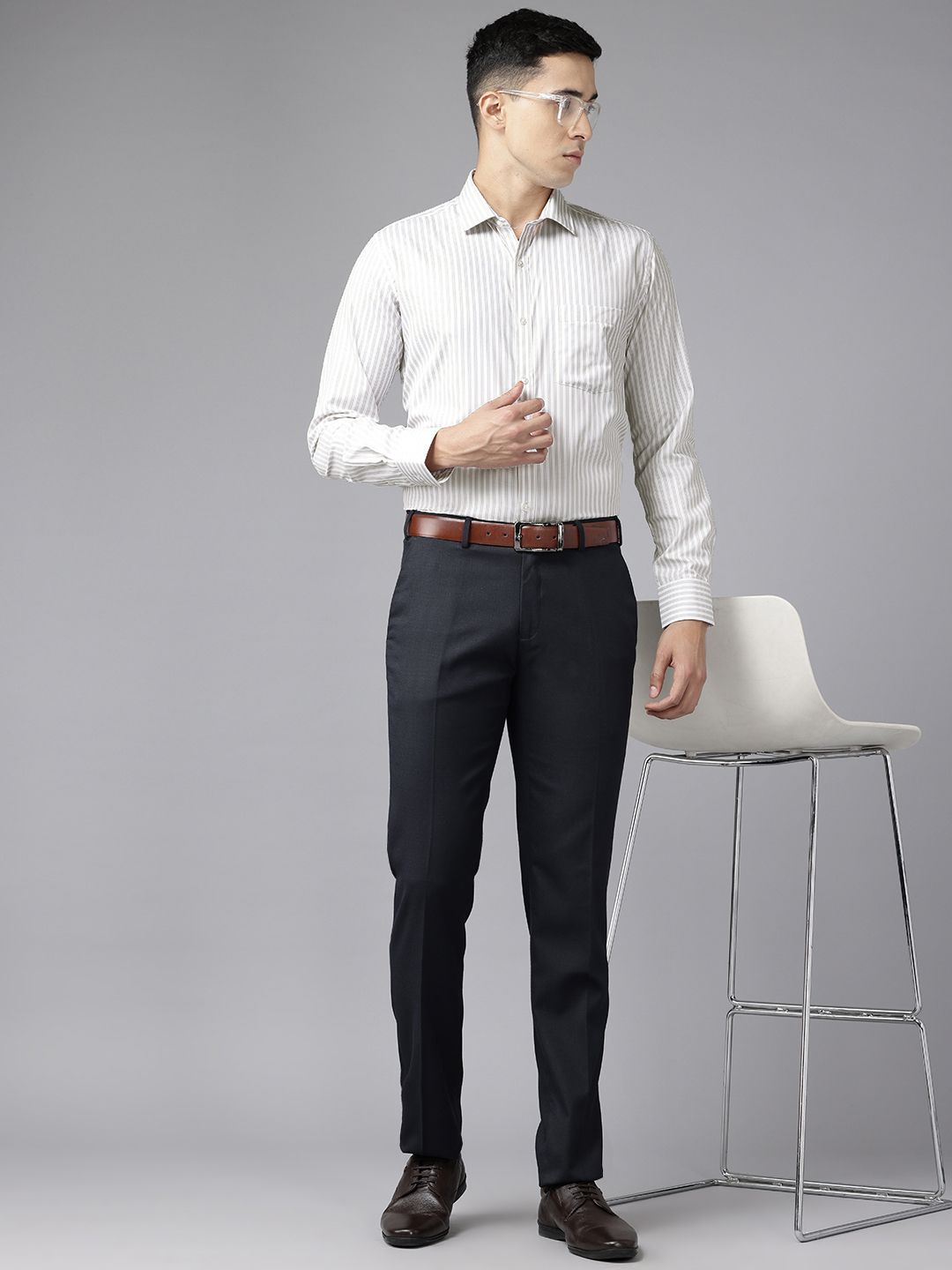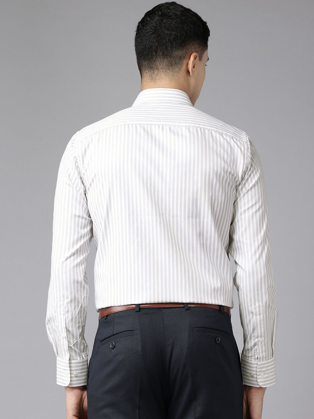 Grey vertical striped opaque formal shirt, has a spread collar, button placket, 1 patch pocket, long regular sleeves, and curved hem
