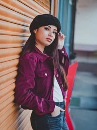 SASSAFRAS Women Burgundy Self-Striped Corduroy Crop Tailored Jacket