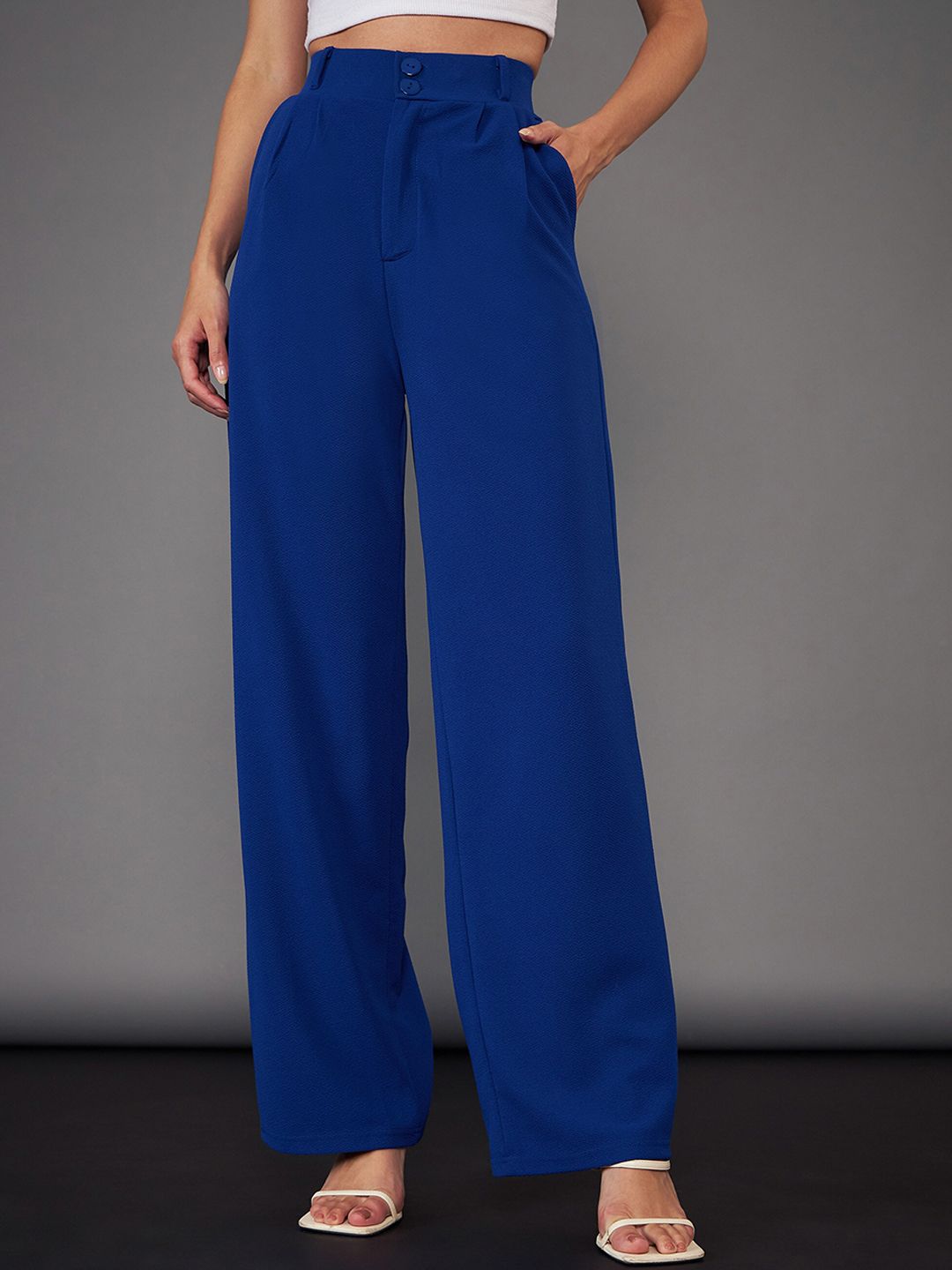 Blue solid mid-rise trousers, has elasticated waistband with belt loops and button closure with side pockets