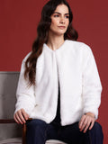 White solid open front jacket with faux fur trim, has a collarless, 2 pockets long sleeves, straight hemline, polyester lining engineered with no
