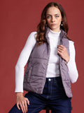 Mauve solid padded jacket, has a stand collar, 2 pockets ,has a zip closure, sleeveless, straight hemline, polyester lining engineered with no