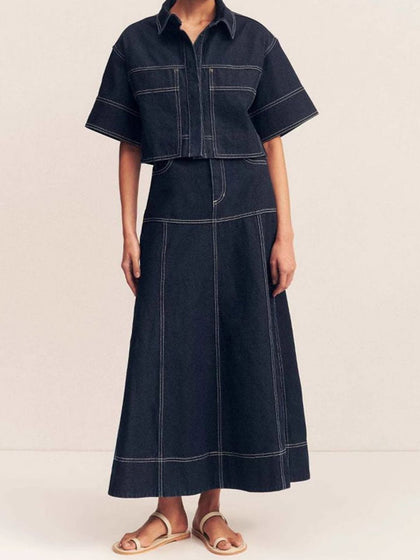 all about you Indigo Edge Denim Self Design Shirt Collar Crop Shirt & Skirt