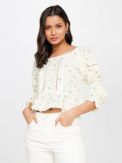 AND Floral Print Round Neck Puff Sleeves Opaque Casual Top