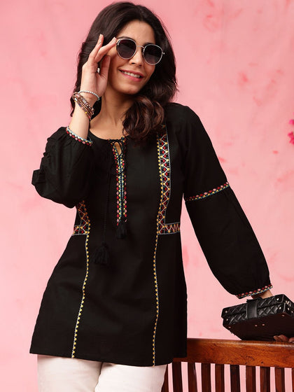 Anouk Black Geometric Embroidered Tie Up Neck Pure Cotton Short Kurti