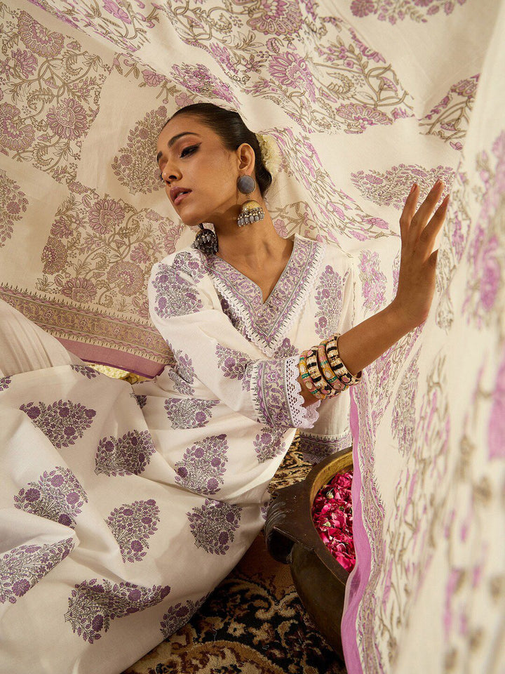 Indo Era Floral Printed Regular Sequinned Pure Cotton Kurta with Trousers & Dupatta