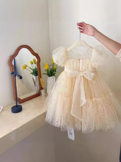 YK Girls Cotton Tulle Printed Puff Sleeve Fit & Flare Dress