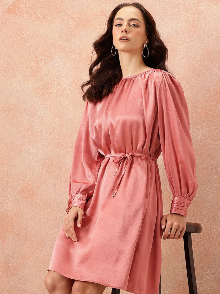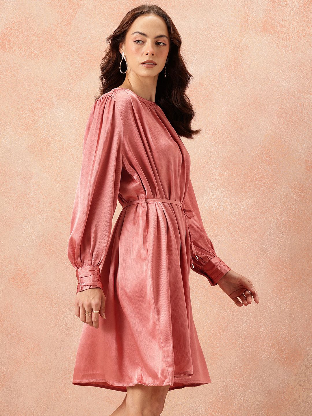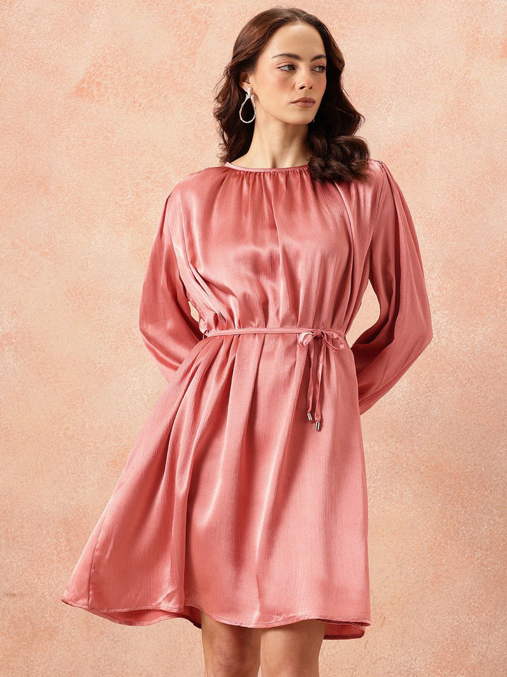 all about you Gathered Detail Bishop Sleeves Party Satin A-Line Dress with Belt