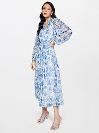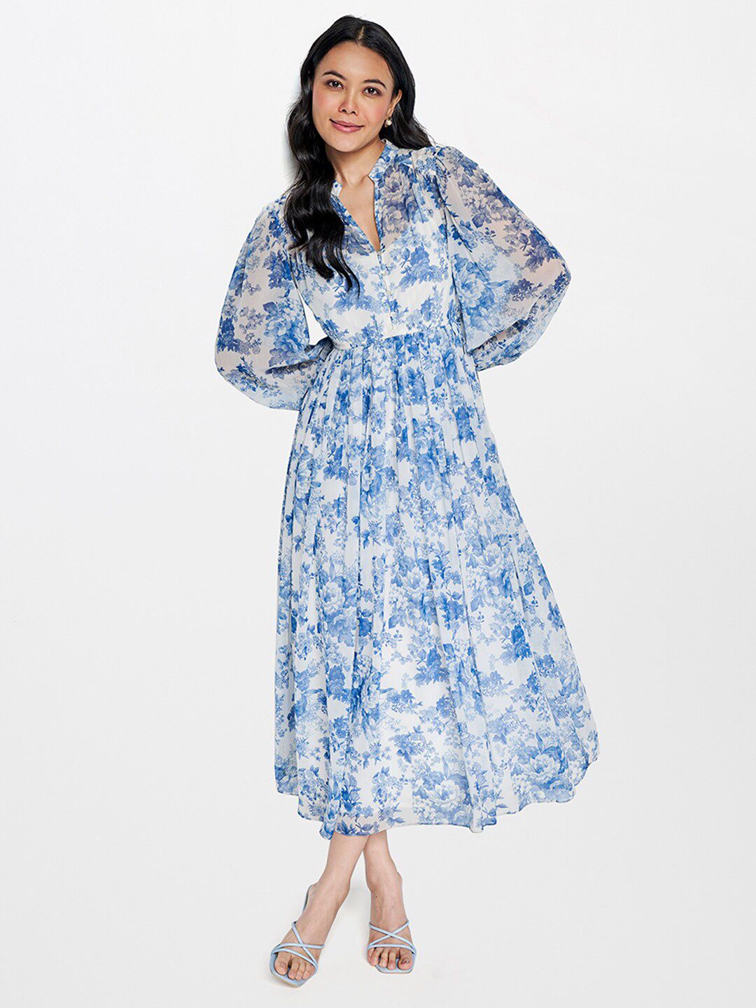 AND Floral Printed Mandarin Collar Puff Sleeve Gathered A-Line Maxi Dress