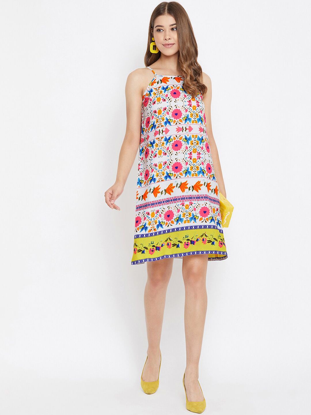 Multicoloured printed woven sheath dress, has shoulder straps, sleeveless, and straight hem