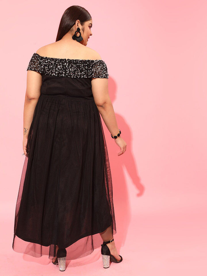 CURVY STREET Black Plus Size Off-Shoulder Net Maxi Dress