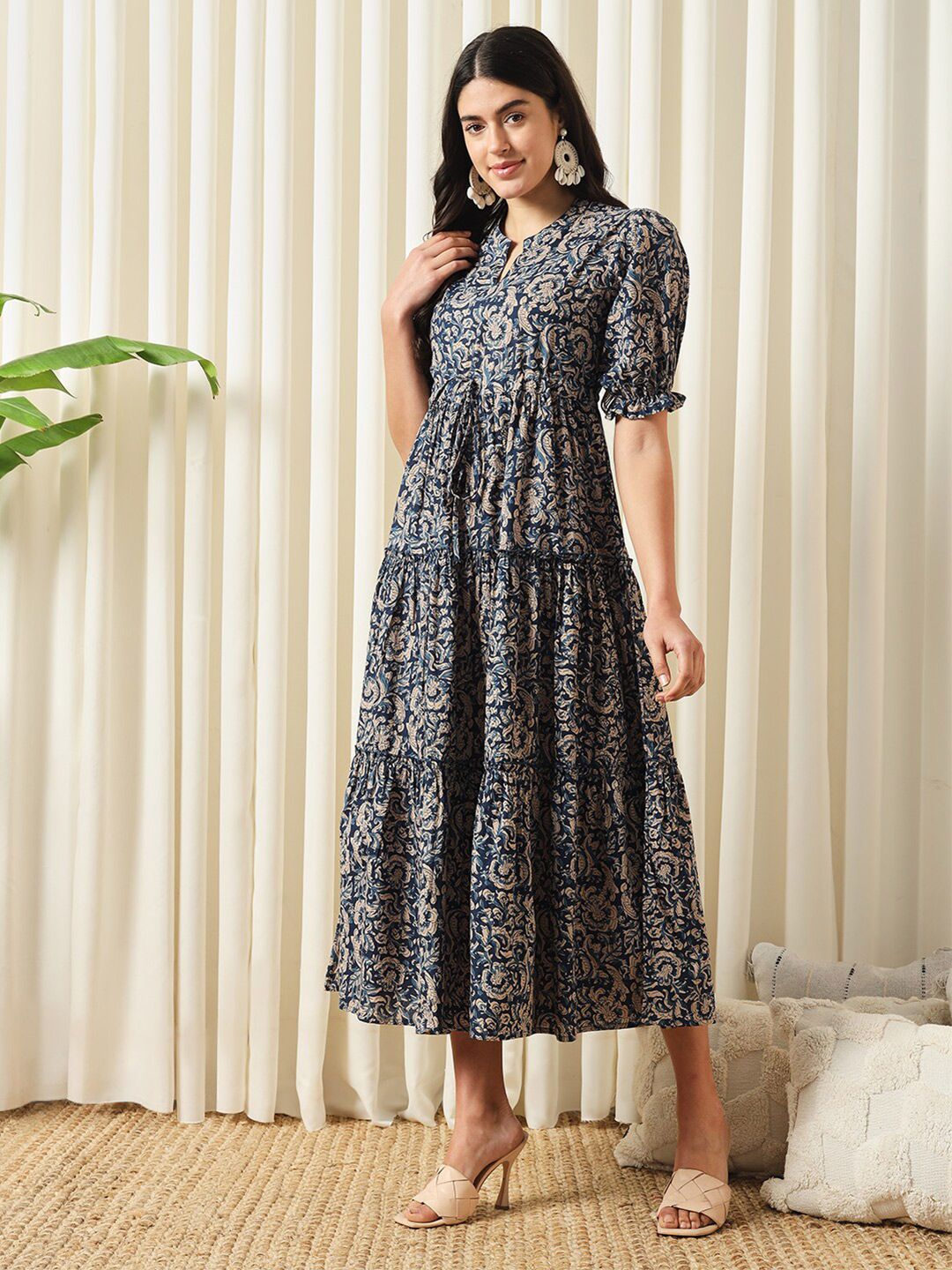 KALINI Floral Printed Mandarin Collar Puff Sleeves Cotton Fit and Flare Dress