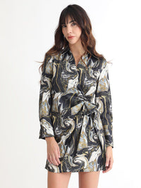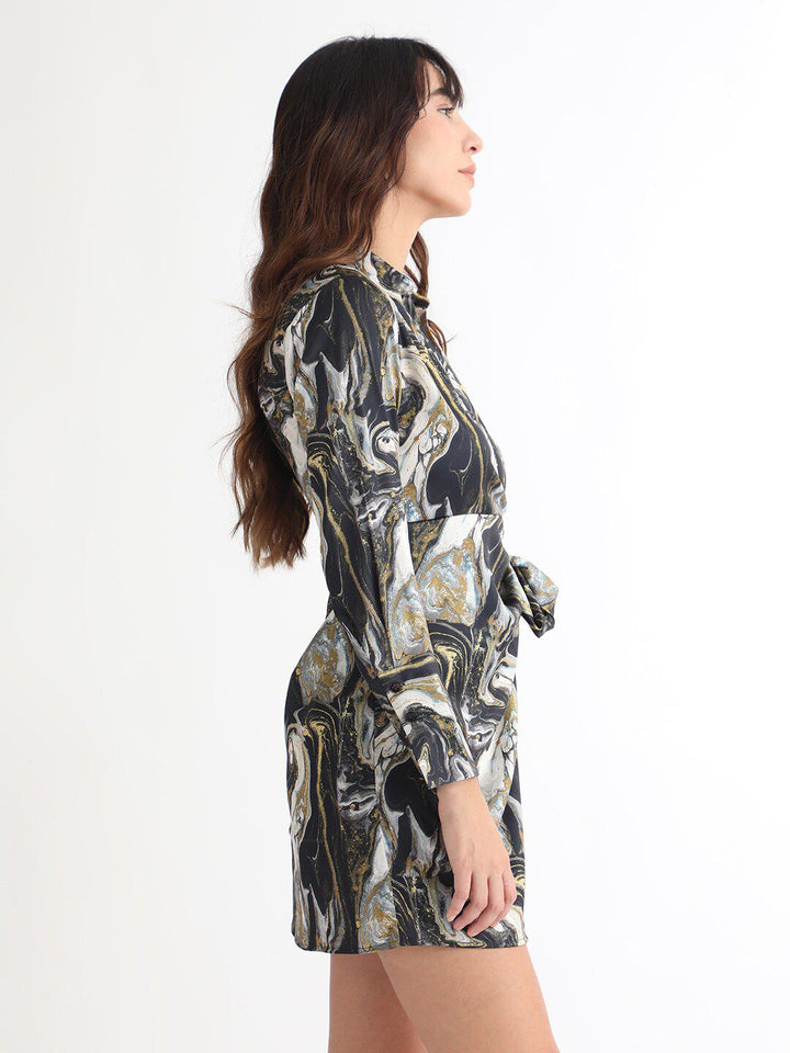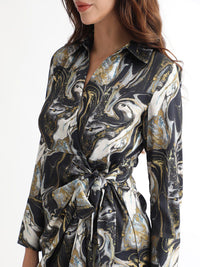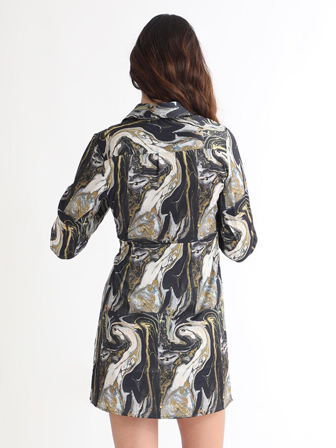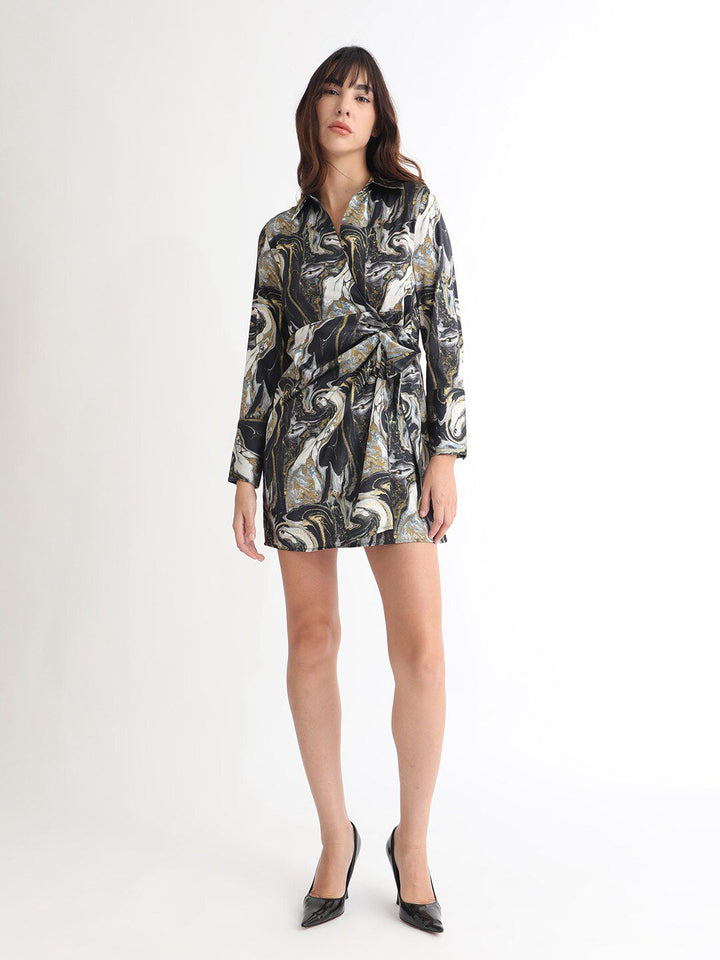 RAREISM Abstract Printed Shirt Collar Cuffed Sleeves Wrap Mini Dress