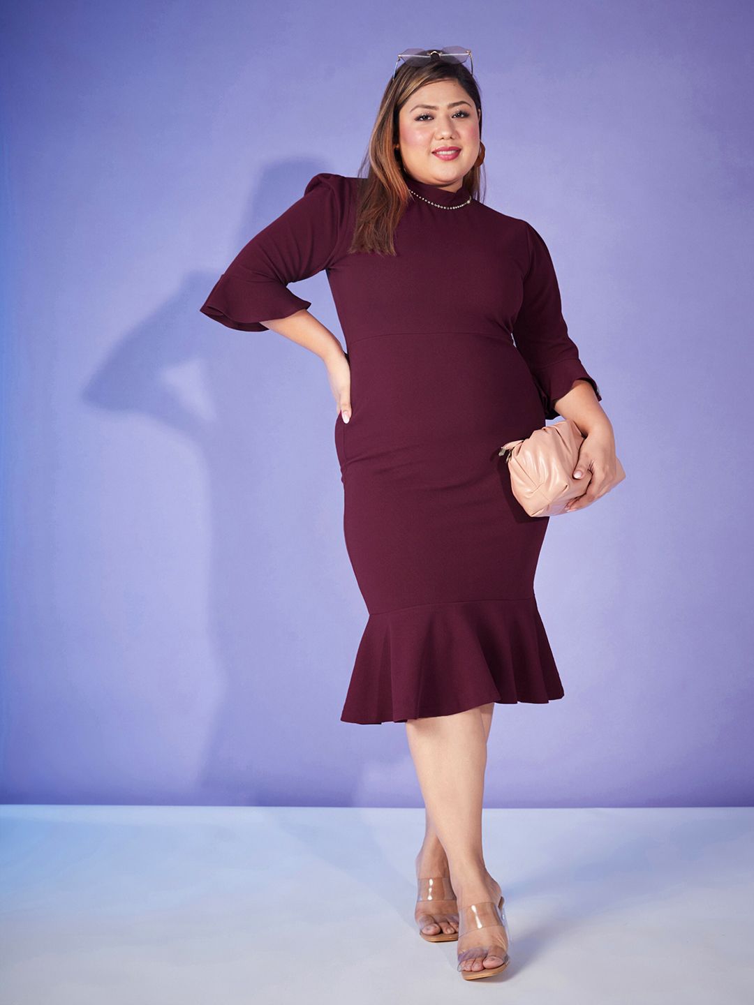 SASSAFRAS Curve Plus Size Burgundy Bell Sleeve Sheath Dress