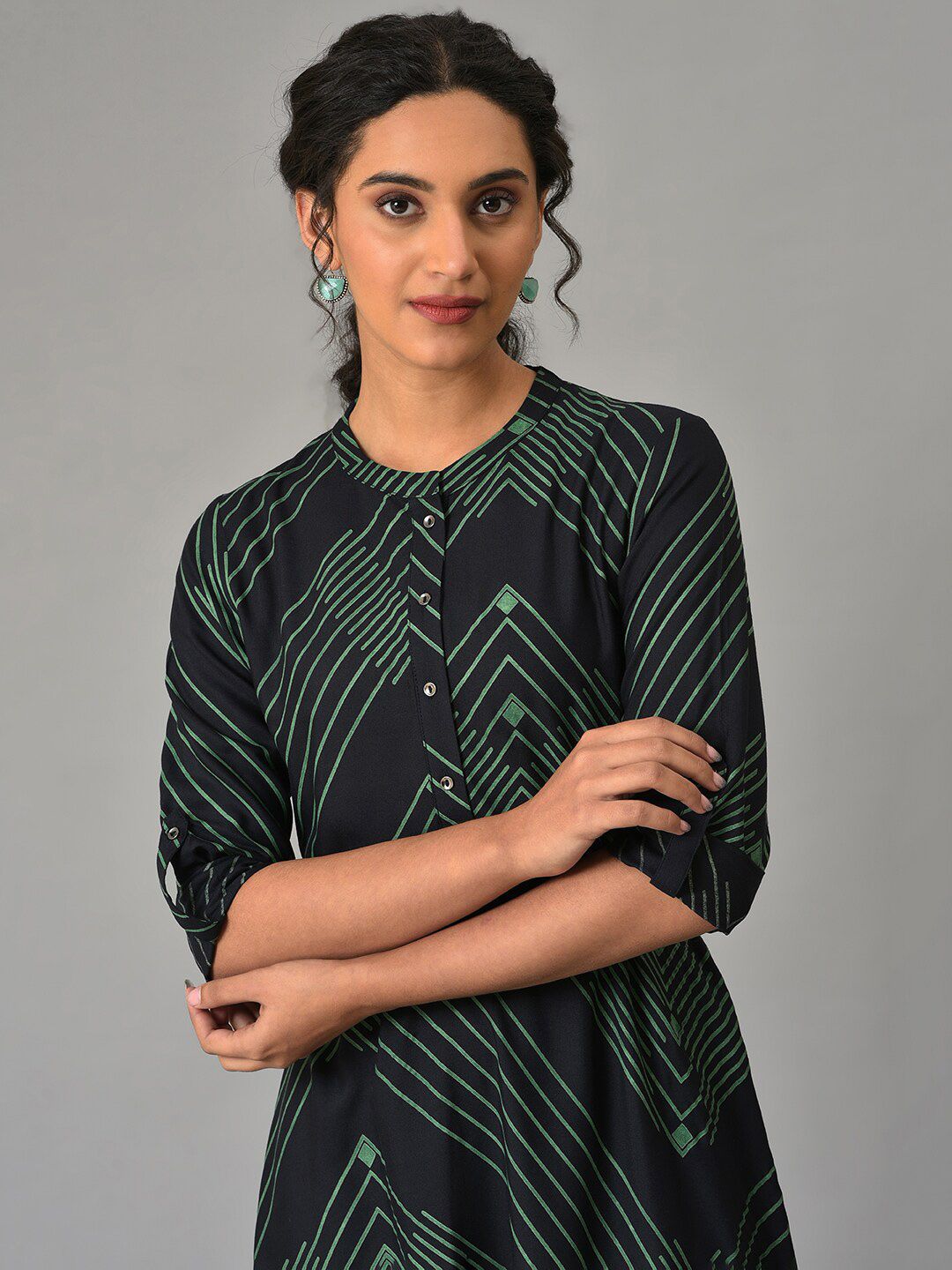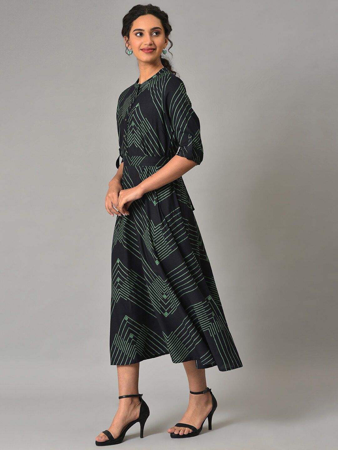 W Geometric Printed Roll-Up Sleeves Midi Dress