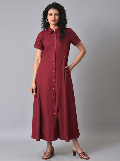 W Flared Hem Pure Cotton Shirt Maxi Dress