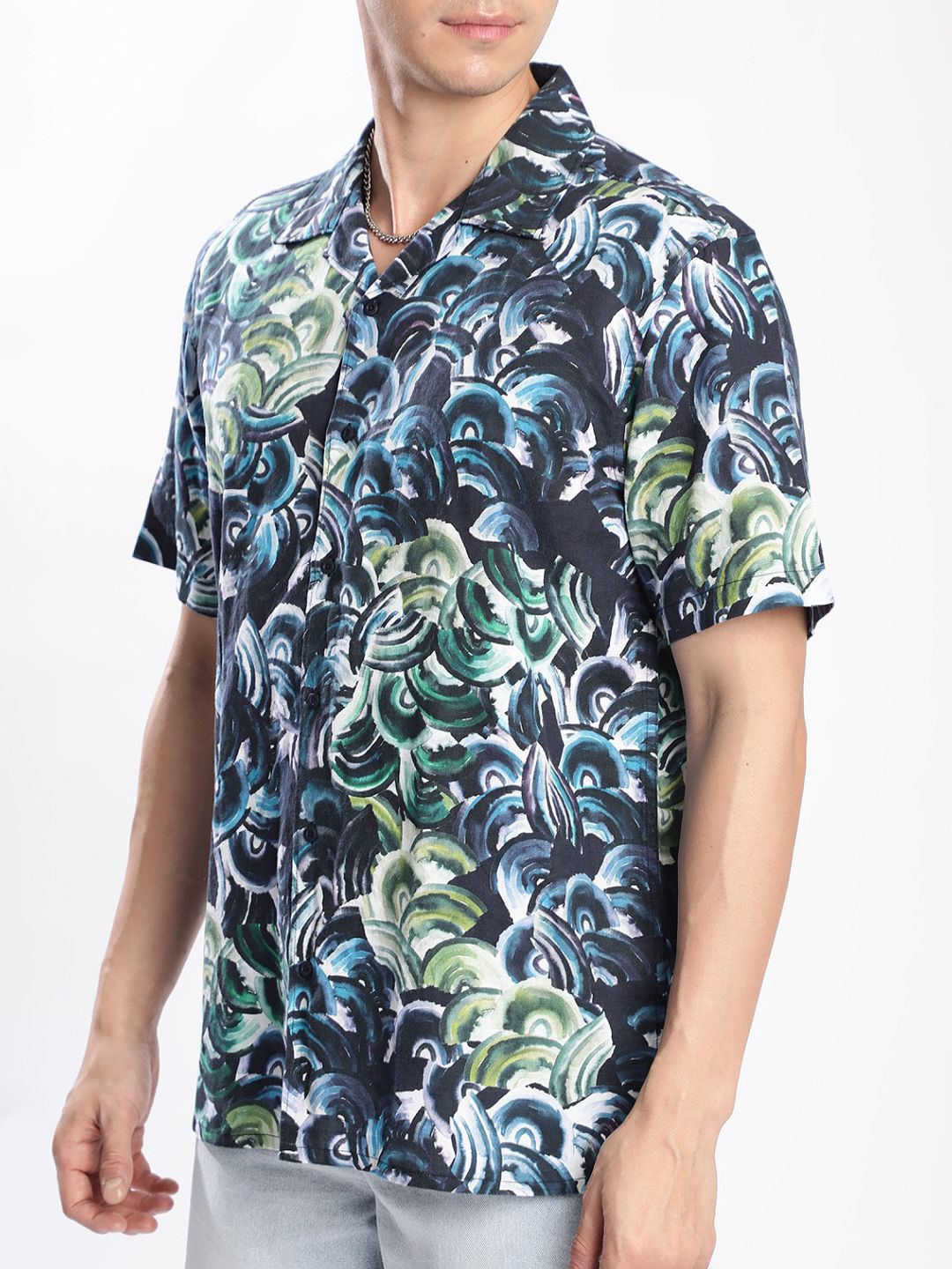 Green abstract printed opaque Casual shirt ,has a cuban collar, button placket, na pocket, short regular sleeves, straight hem