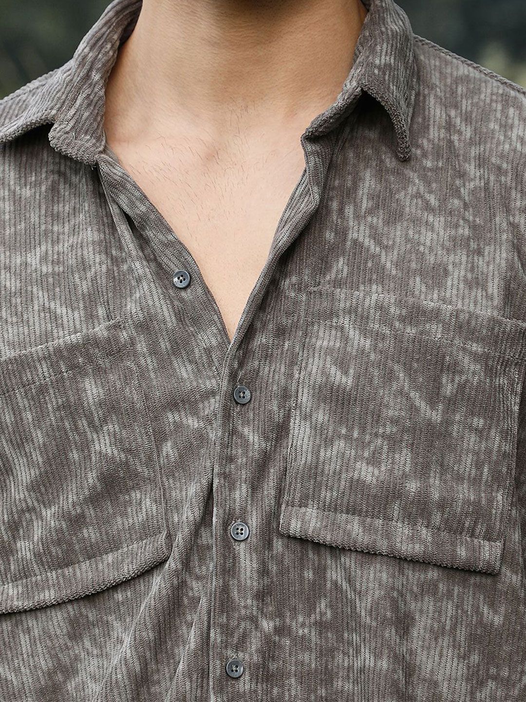 Grey textured opaque casual shirt, has a spread collar, button placket, no pocket, long regular sleeves, curved hem