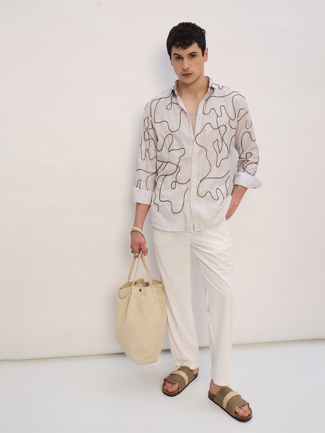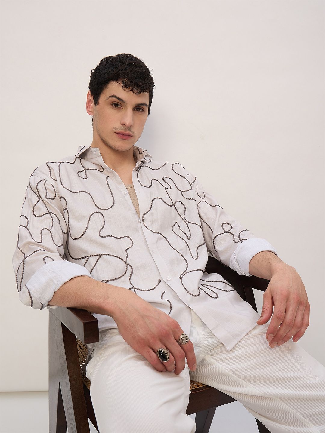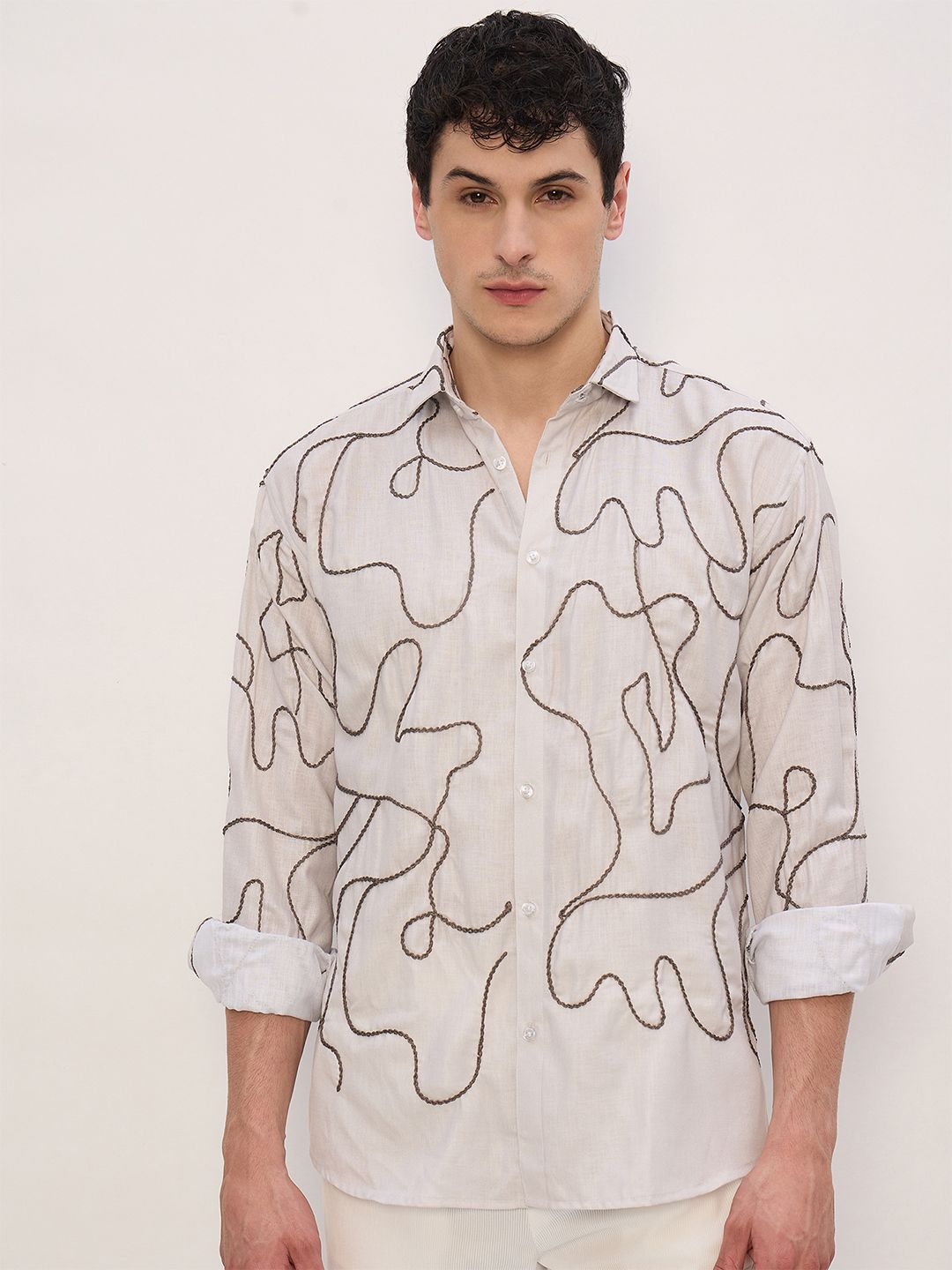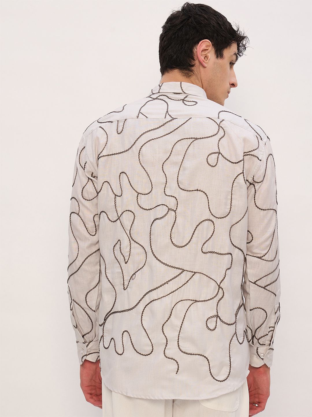 Beige & Grey Embroidered printed opaque Casual shirt ,has a spread collar, button placket, na pocket, long drop-shoulder sleeves, curved hem