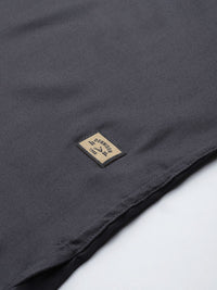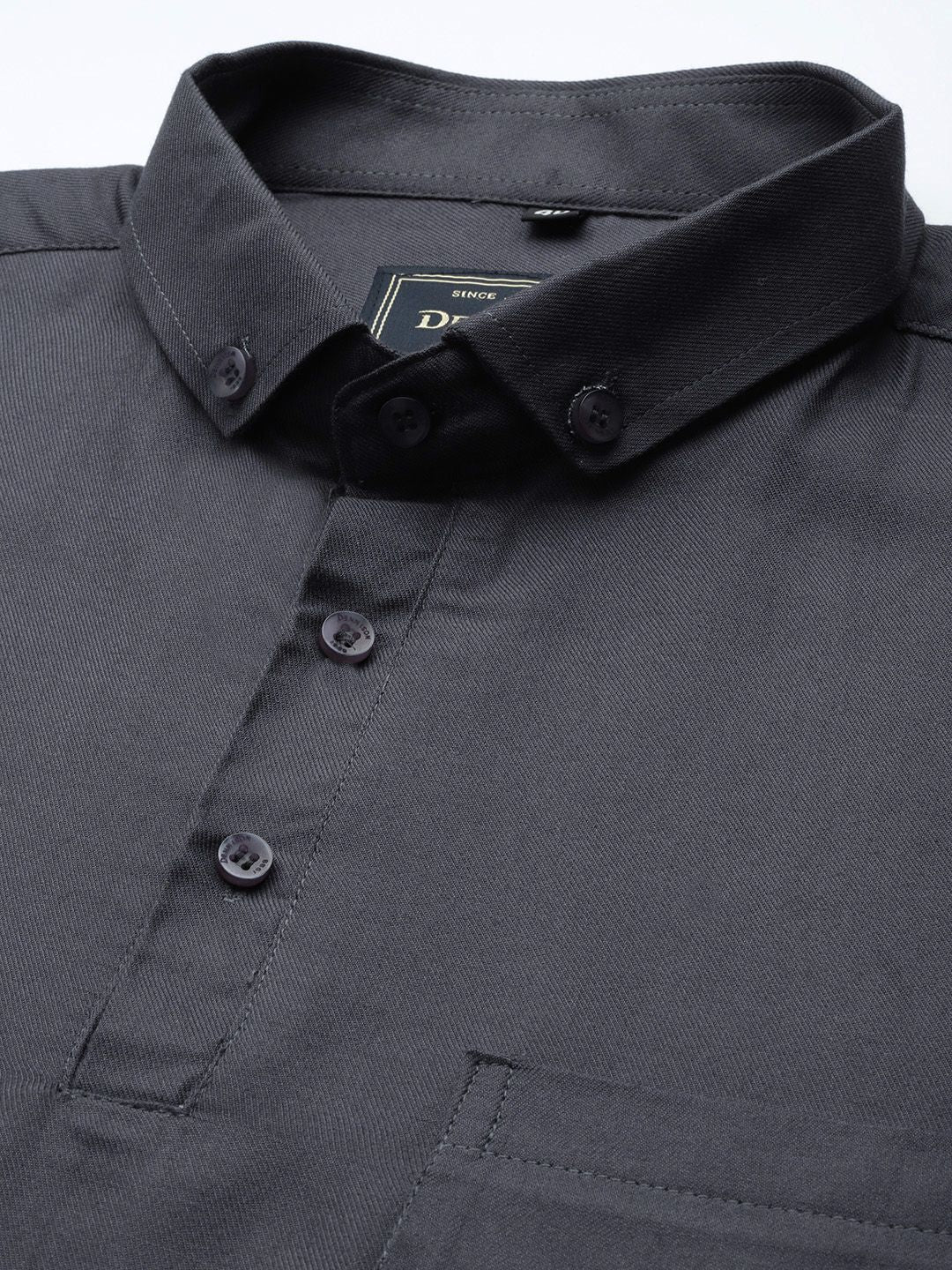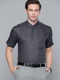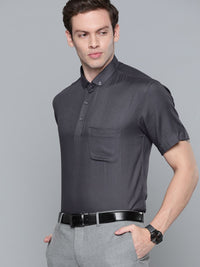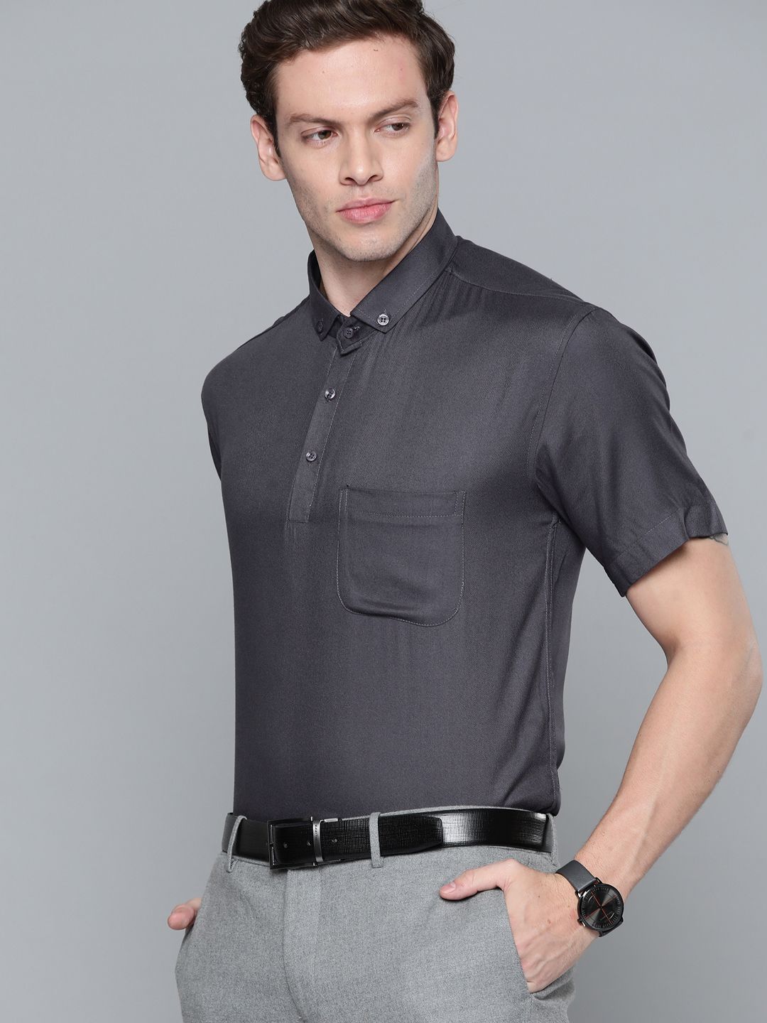 Grey solid opaque formal shirt ,has a button-down collar, button placket, 1 patch pocket, short regular sleeves, curved hem