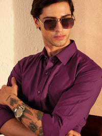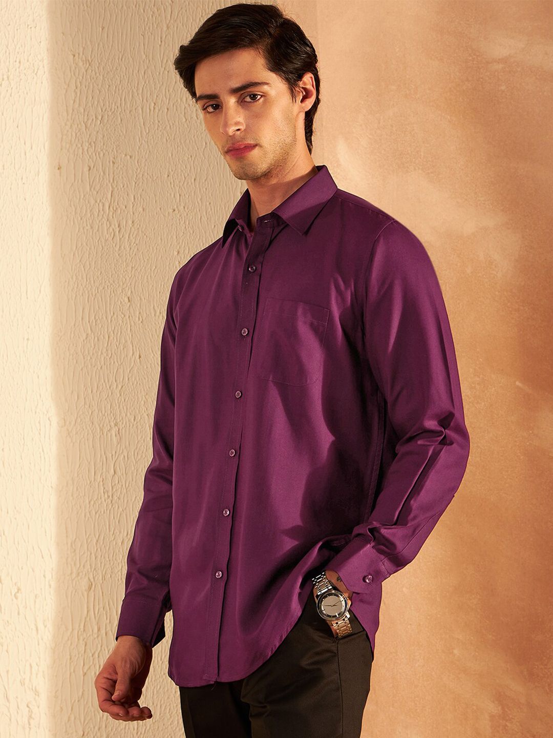 Purple solid opaque casual shirt, has a spread collar, button placket, 1 patch pocket, long regular sleeves, curved hem