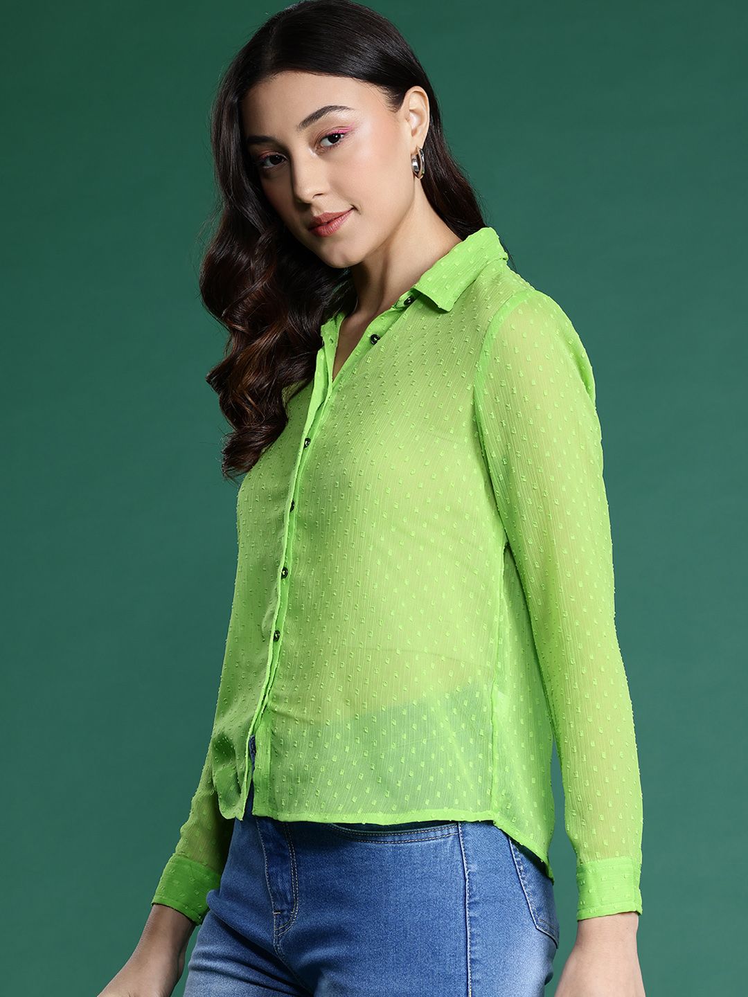 Green textured sheer Casual shirt with dobby weave ,has a spread collar, button placket, long regular sleeves, curved hem