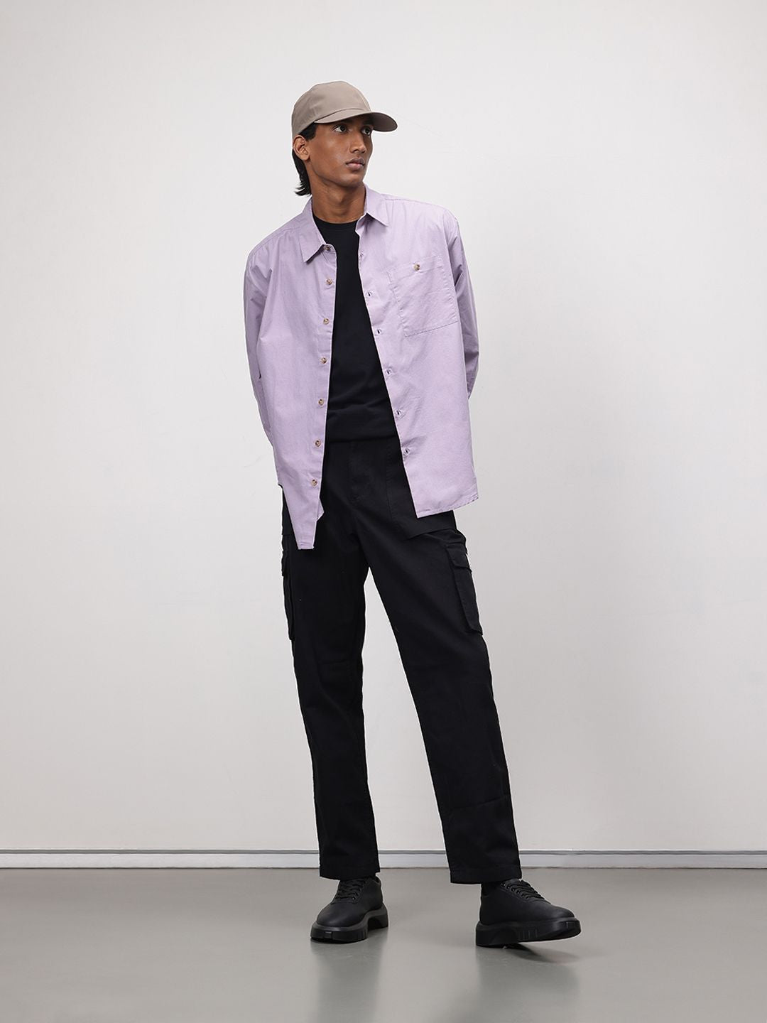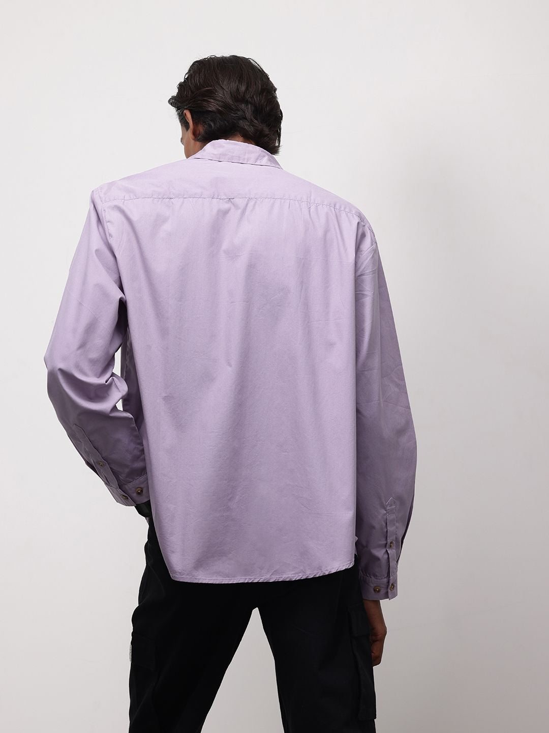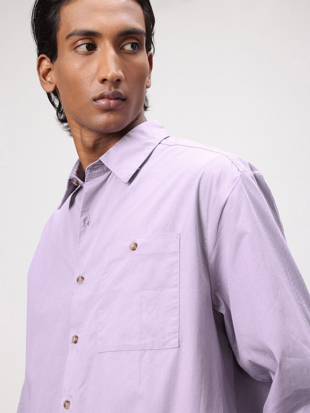 Lavender solid opaque Casual shirt ,has a spread collar, button placket, 1 patch pocket, long drop-shoulder sleeves, curved hem