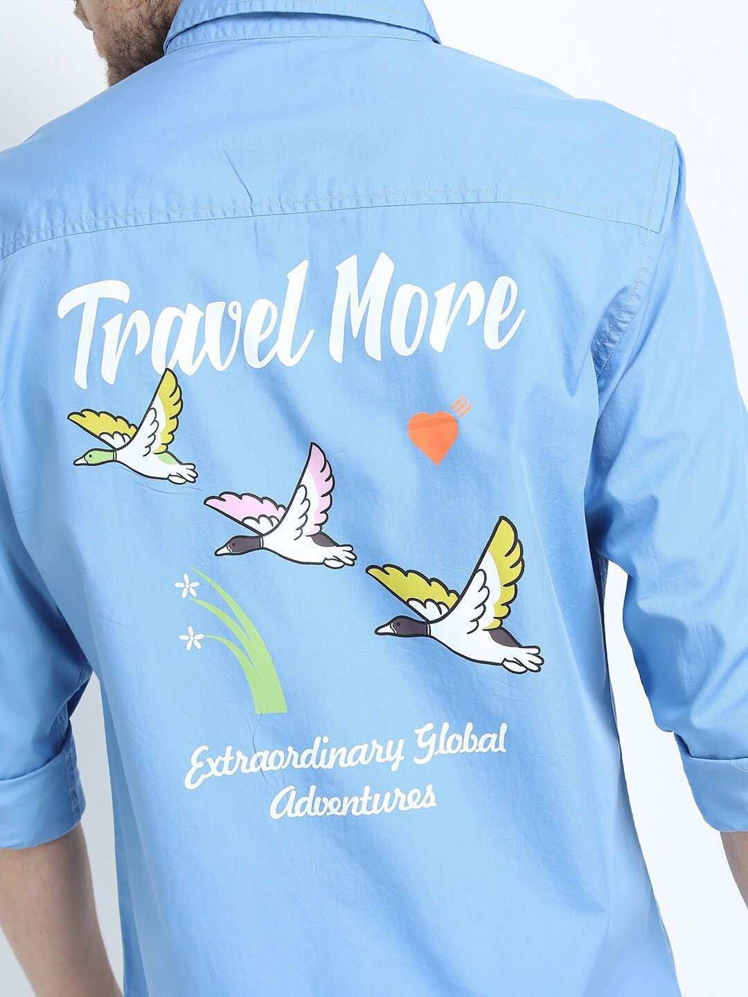 Blue graphic printed opaque Casual shirt ,has a spread collar, button placket, 1 patch pocket, long regular sleeves, curved hem