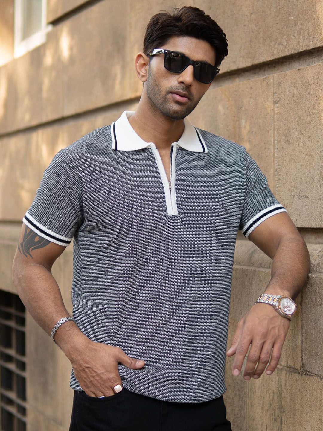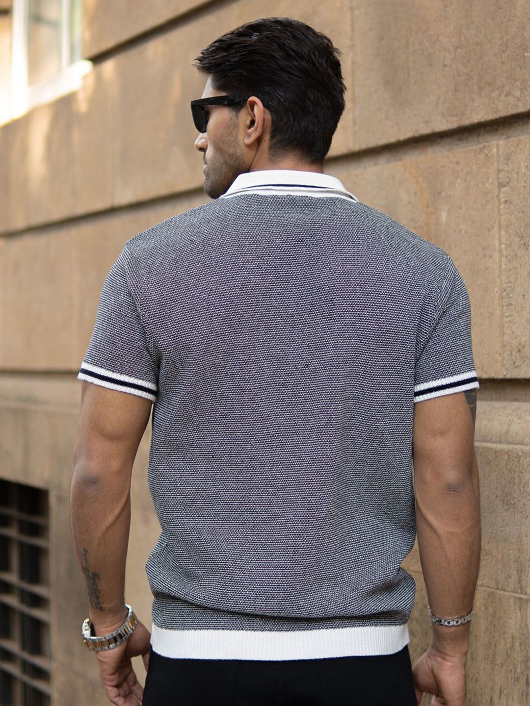 Powerlook Men Black Knitted Zipper Polo Collar Regular Fit T-shirt