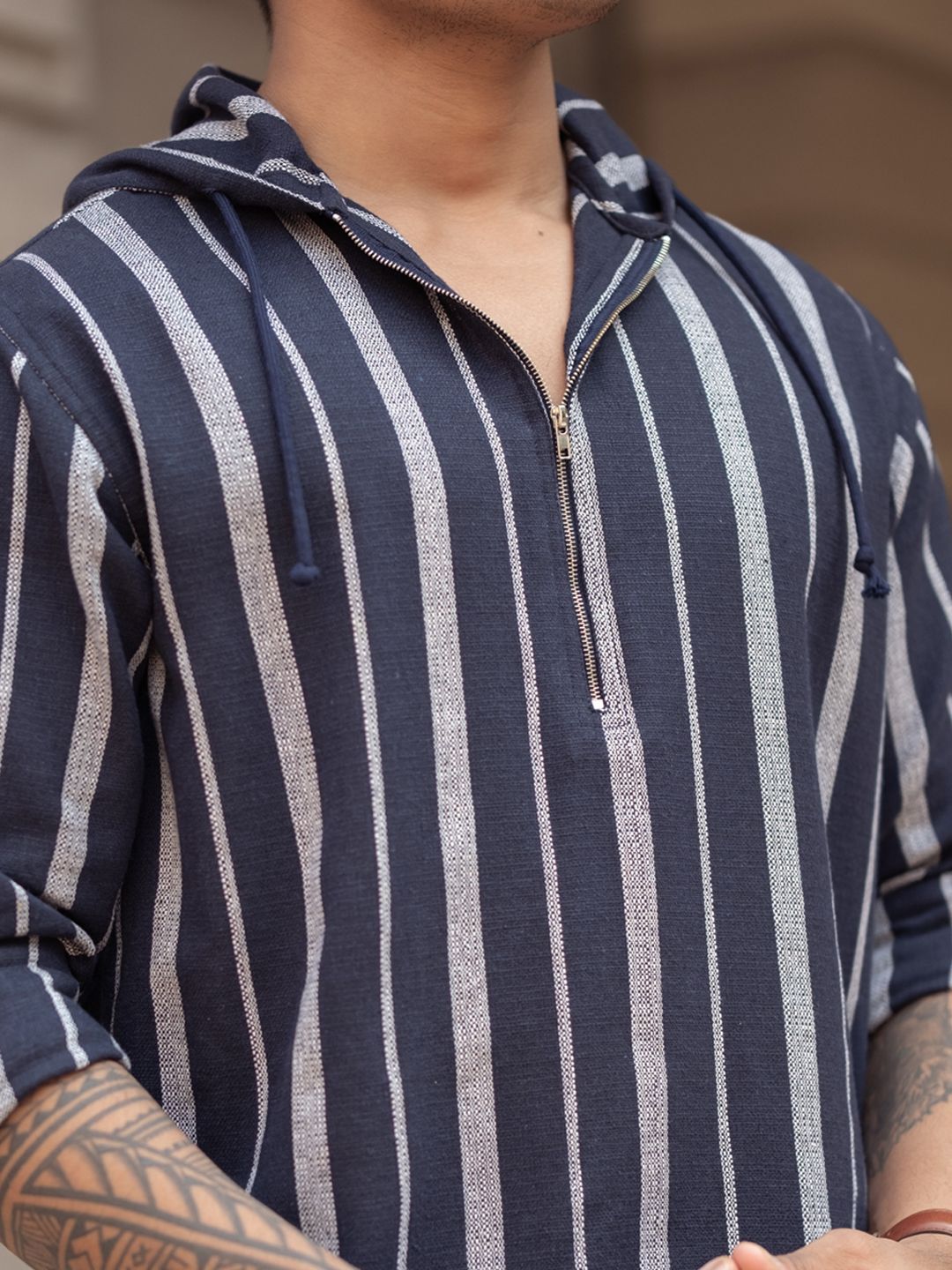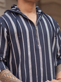 Navy Blue, white vertical striped opaque Casual shirt ,has a hooded, zip placket, long regular sleeves, straight hem
