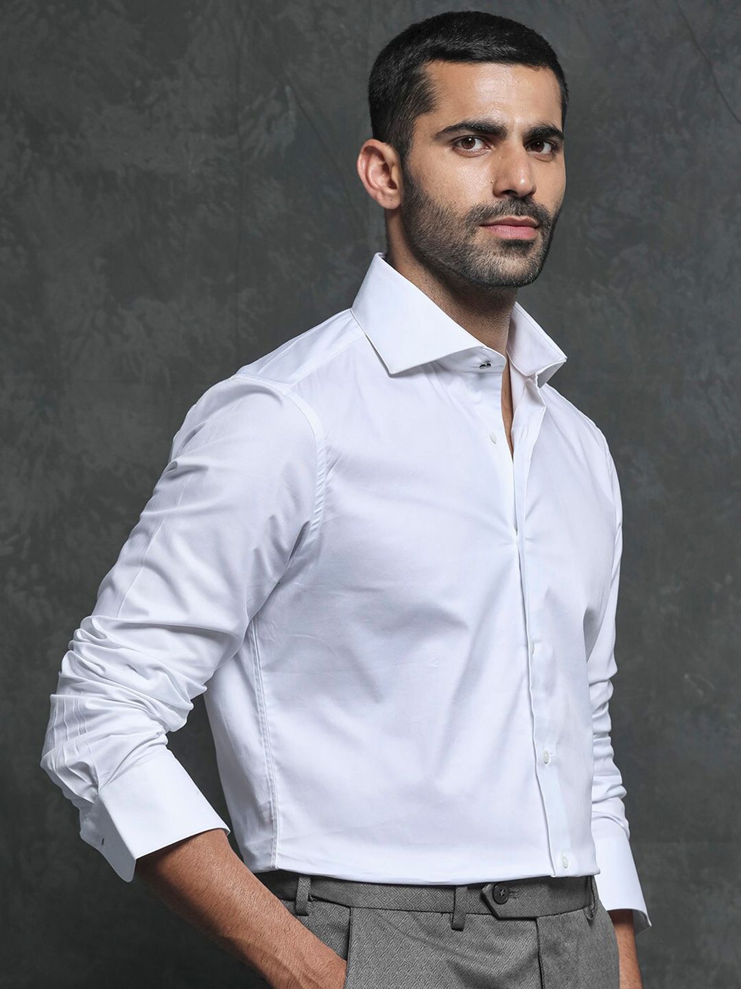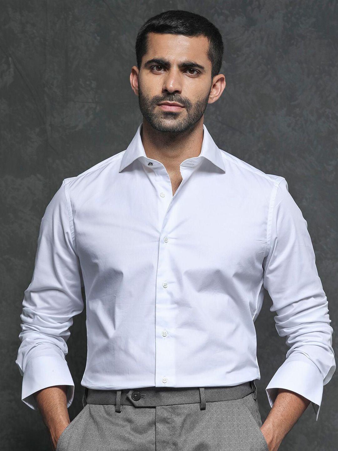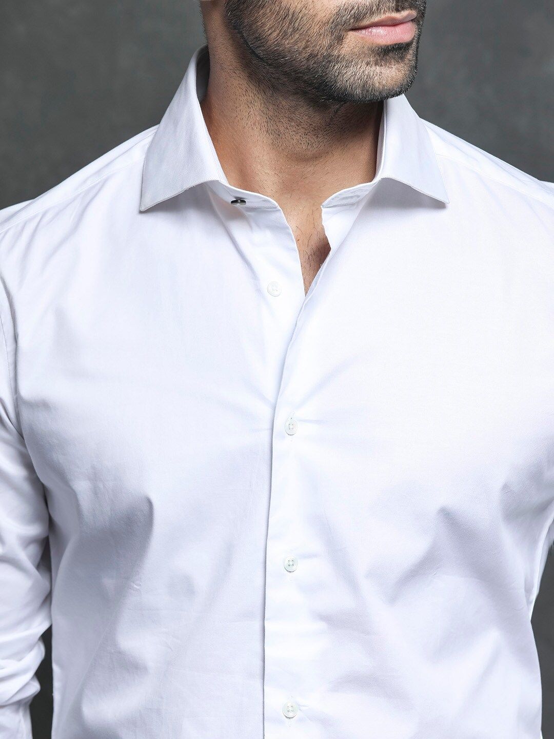 White solid opaque formal shirt ,has a spread collar, button placket, long regular sleeves, curved hem