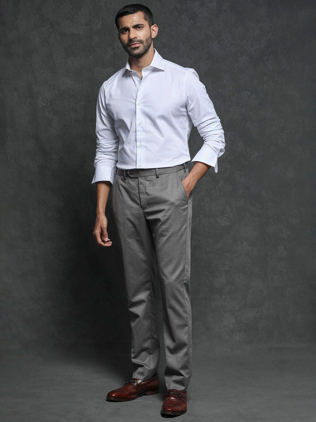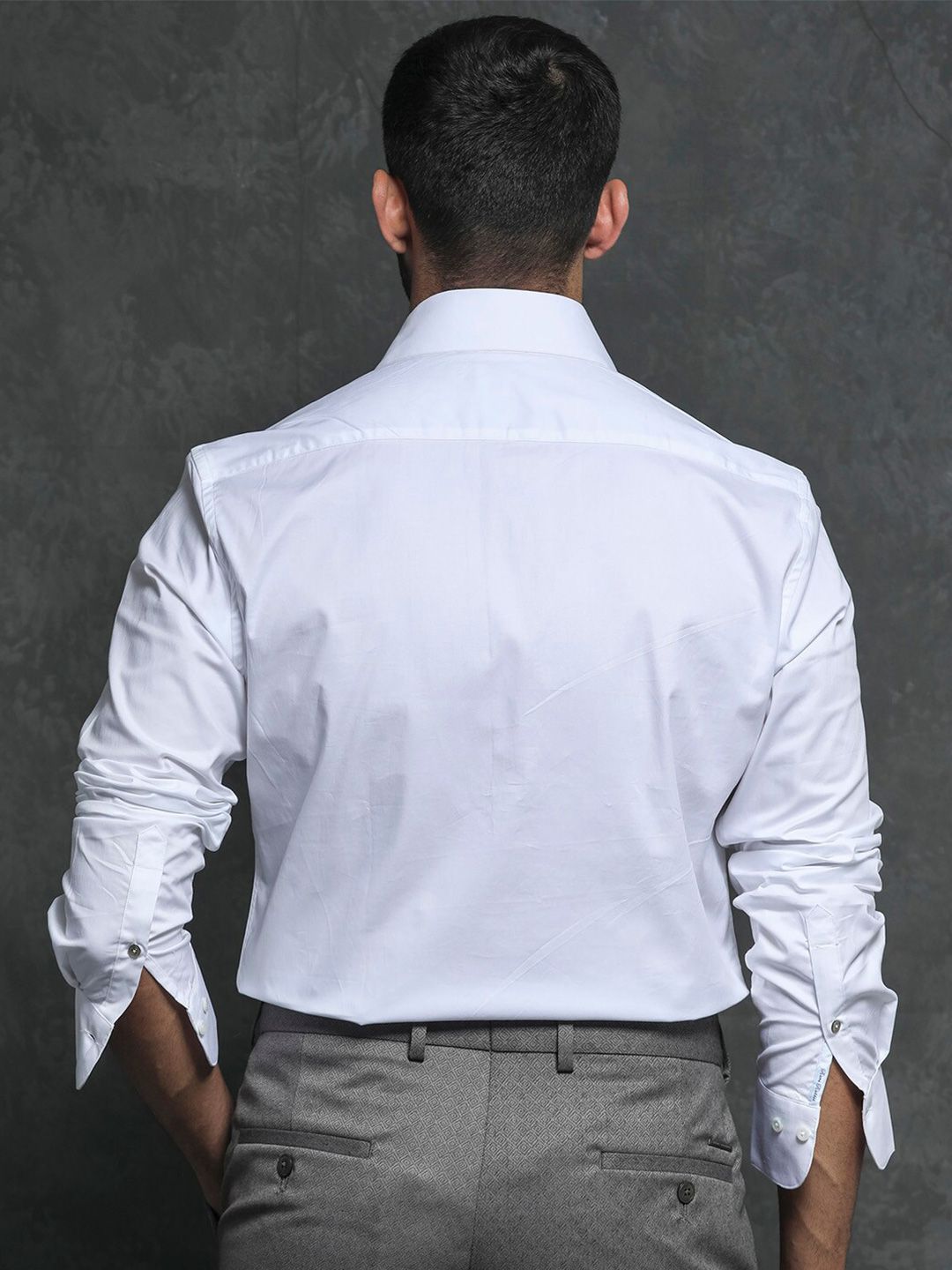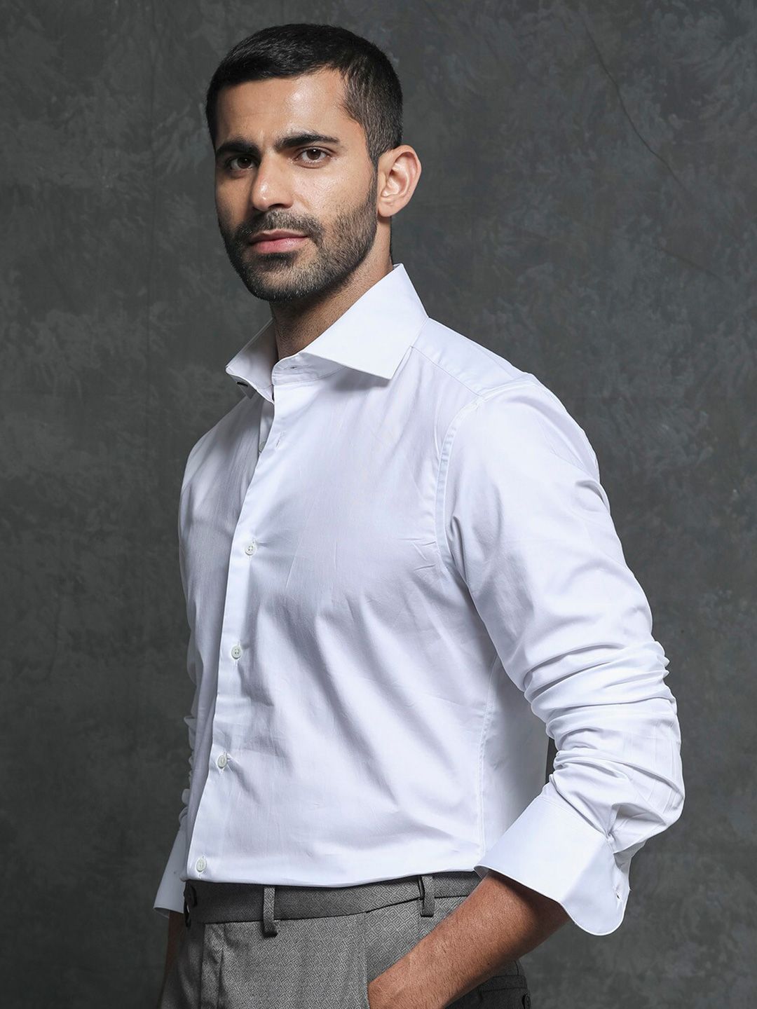 White solid opaque formal shirt ,has a spread collar, button placket, long regular sleeves, curved hem