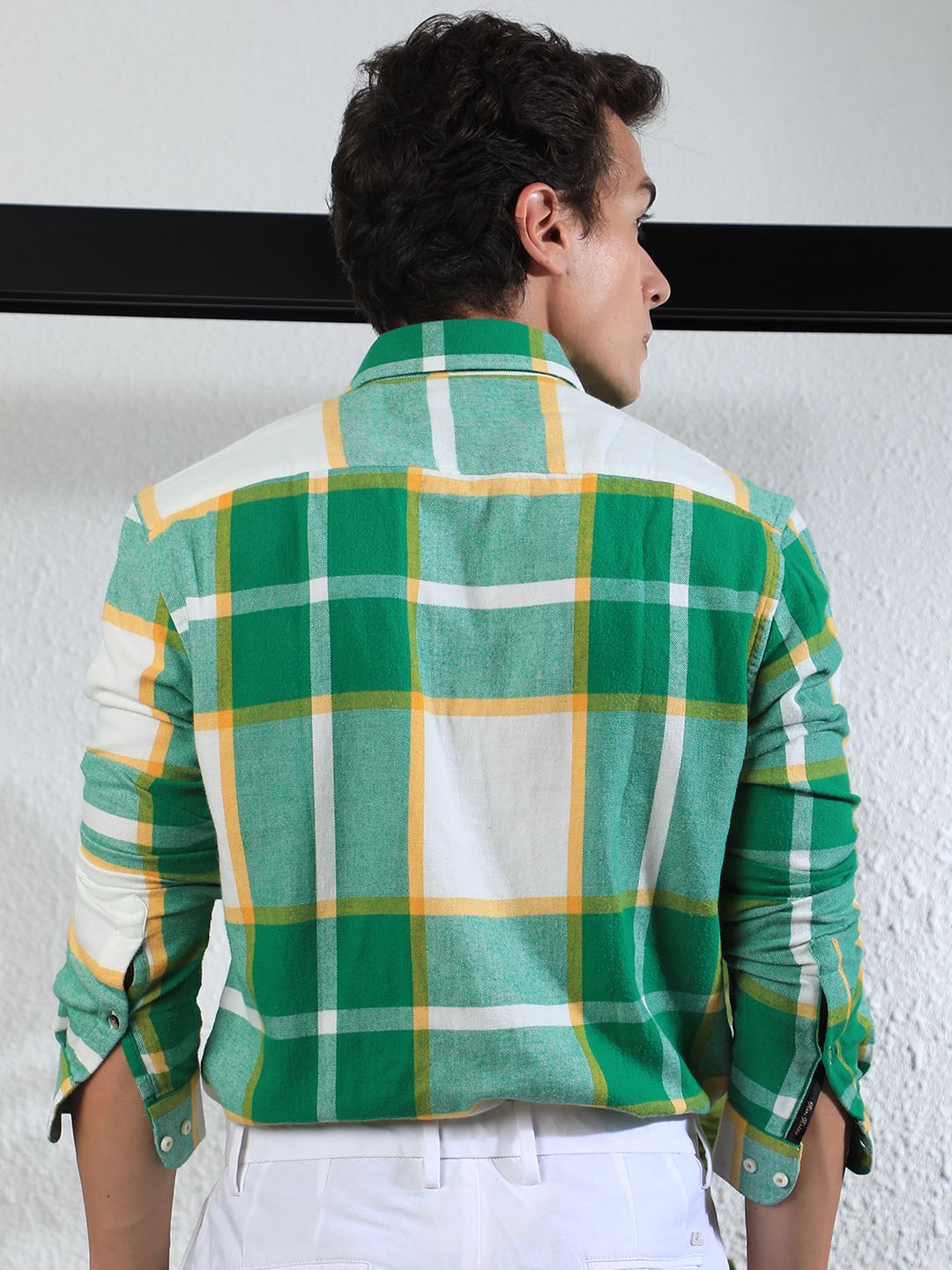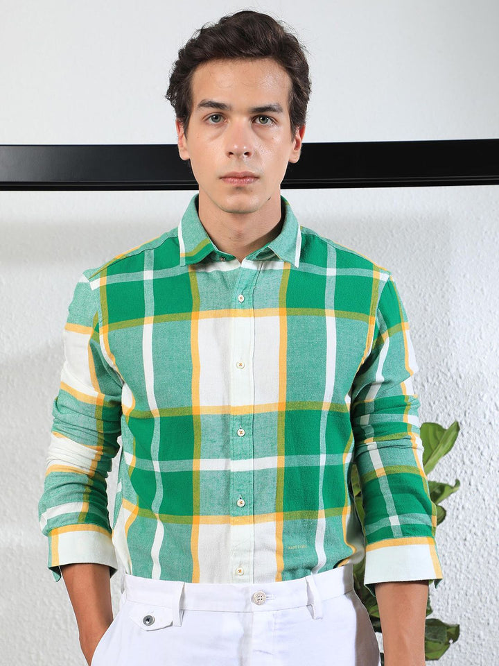 Green & white tartan checks opaque Casual shirt ,has a spread collar, button placket, long regular sleeves, curved hem