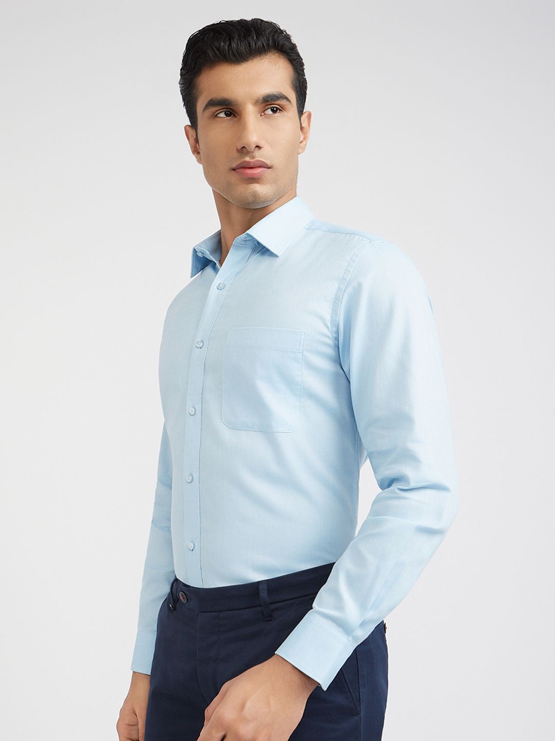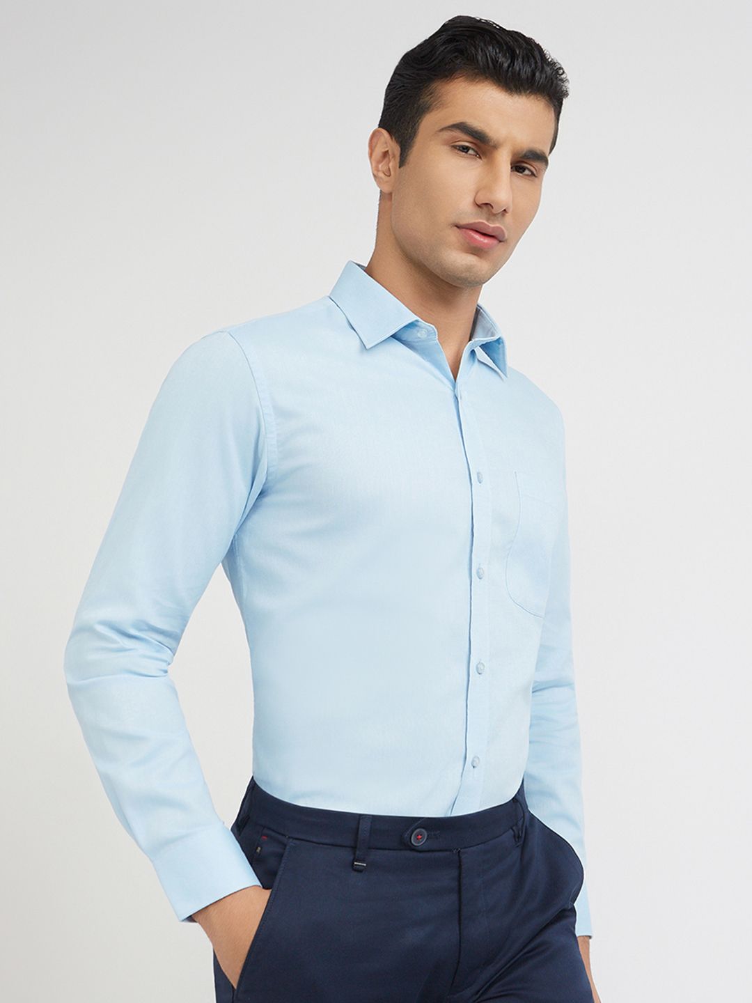 Blue textured self design Formal shirt ,has a cutaway collar, button placket, 1 patch pocket, long regular sleeves, curved hem