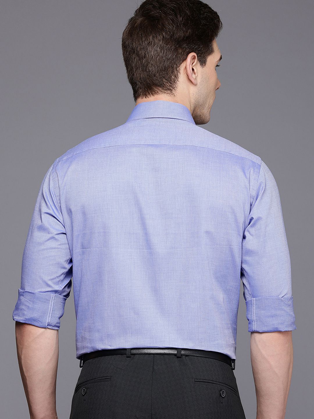 Blue micro checked opaque formal shirt, has a spread collar, button placket, 1 patch pocket, long regular sleeves, curved hem