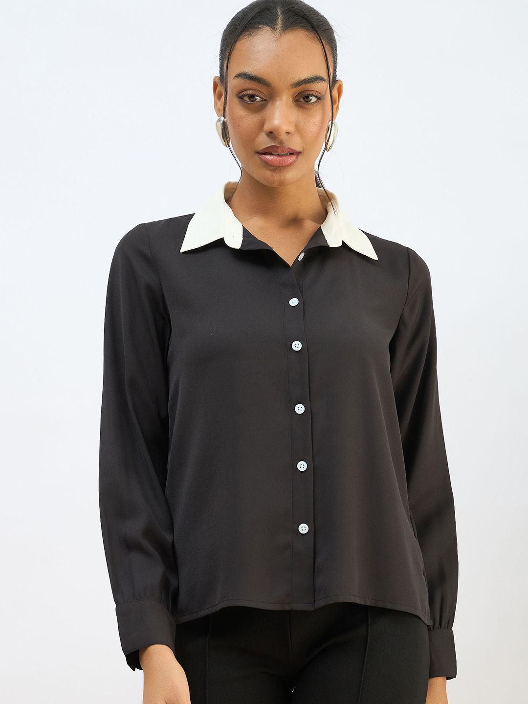 Black solid opaque Casual shirt ,has a spread collar, button placket, na pocket, long regular sleeves, straight hem