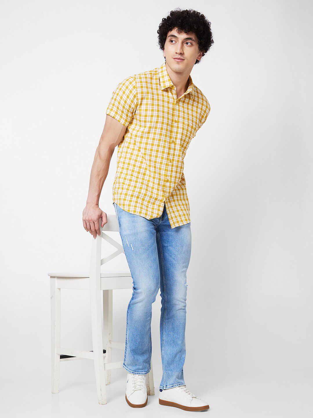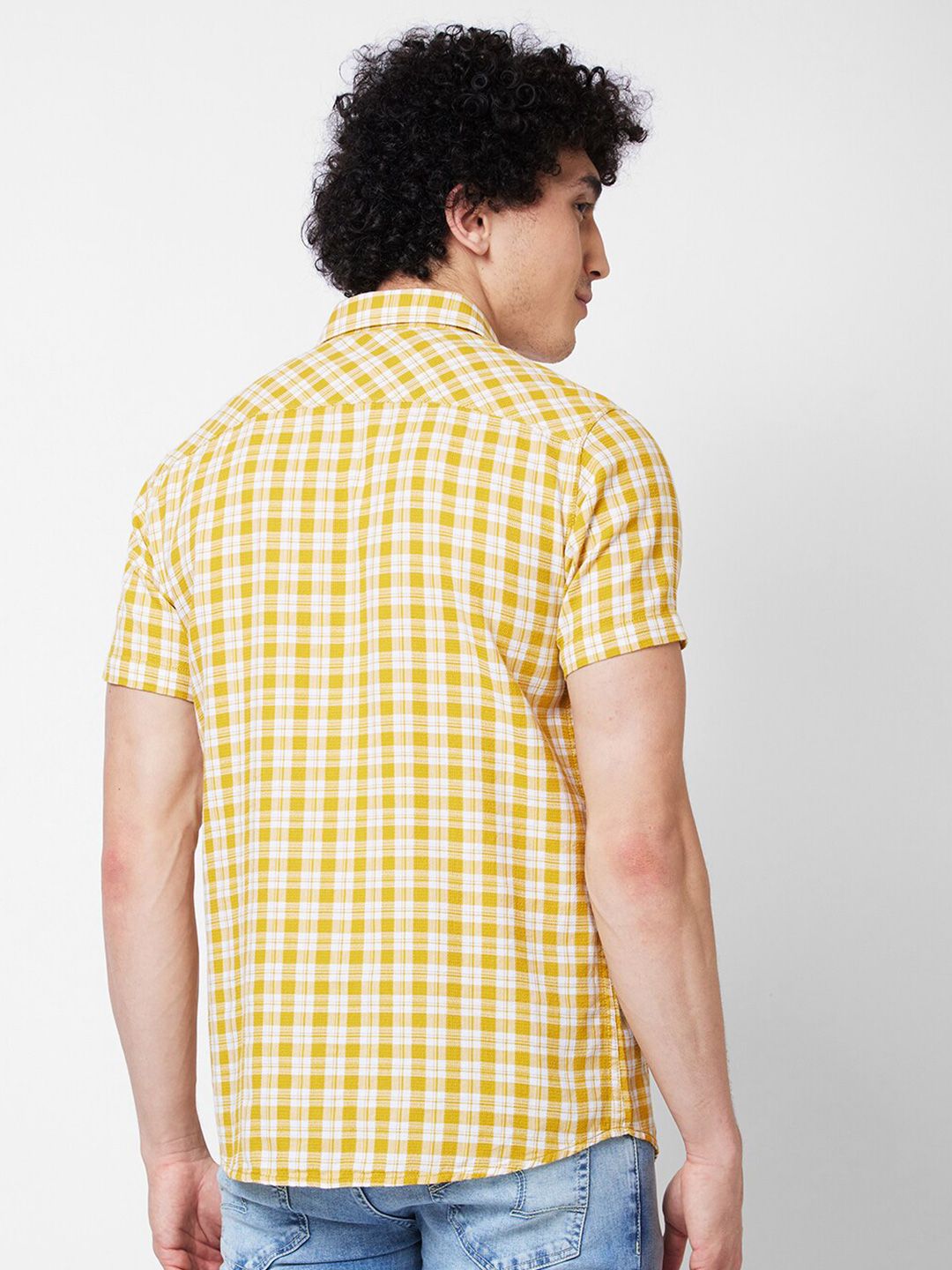 Yellow gingham checked opaque Casual shirt ,has a spread collar, button placket, 1 pocket, short regular sleeves, curved hem