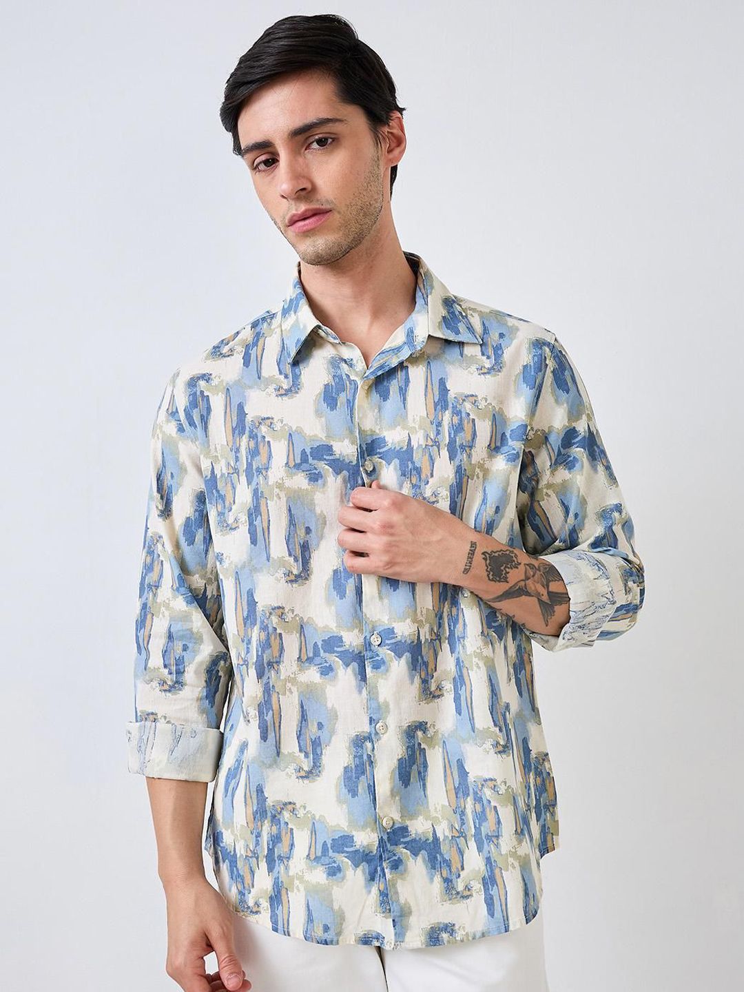 Blue floral printed opaque Casual shirt ,has a spread collar, button placket, na pocket, long regular sleeves, curved hem