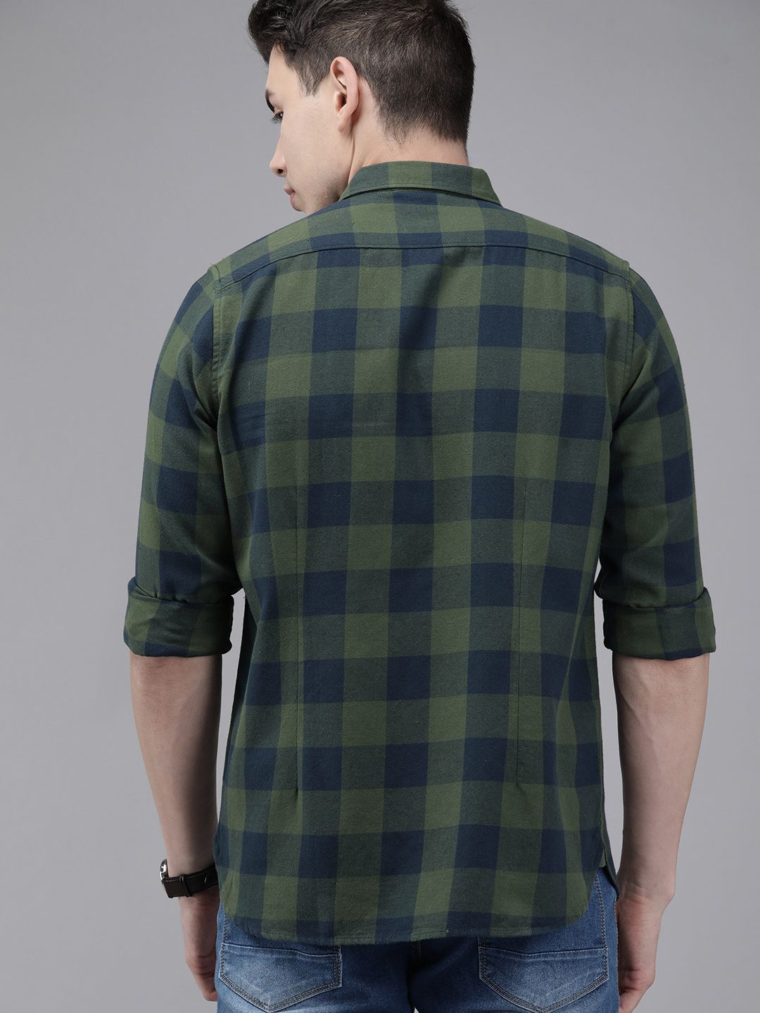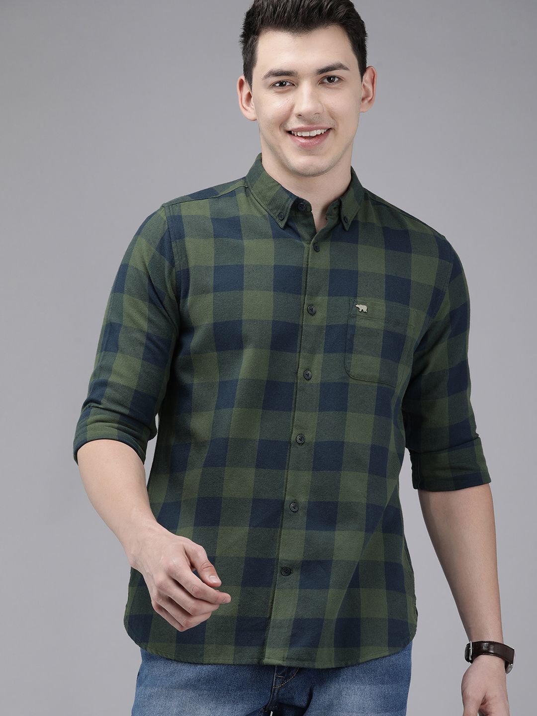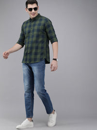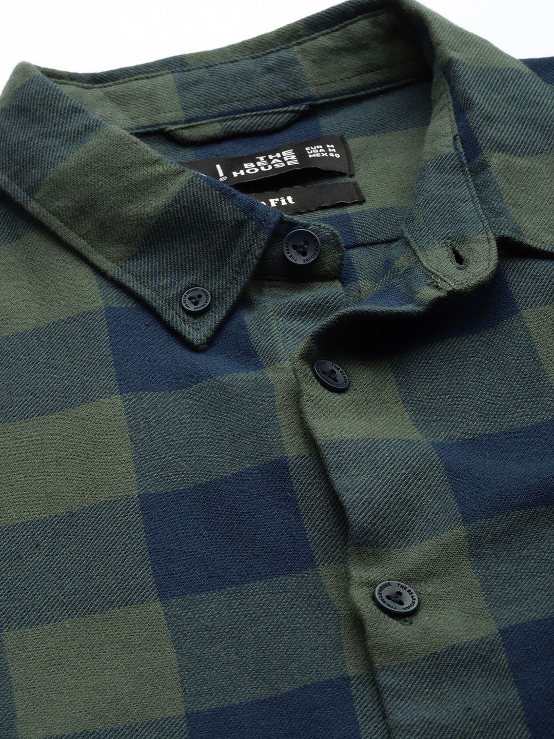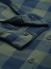 THE BEAR HOUSE Men Olive Green & Navy Blue Pure Cotton Slim Fit Checked Flannel Shirt