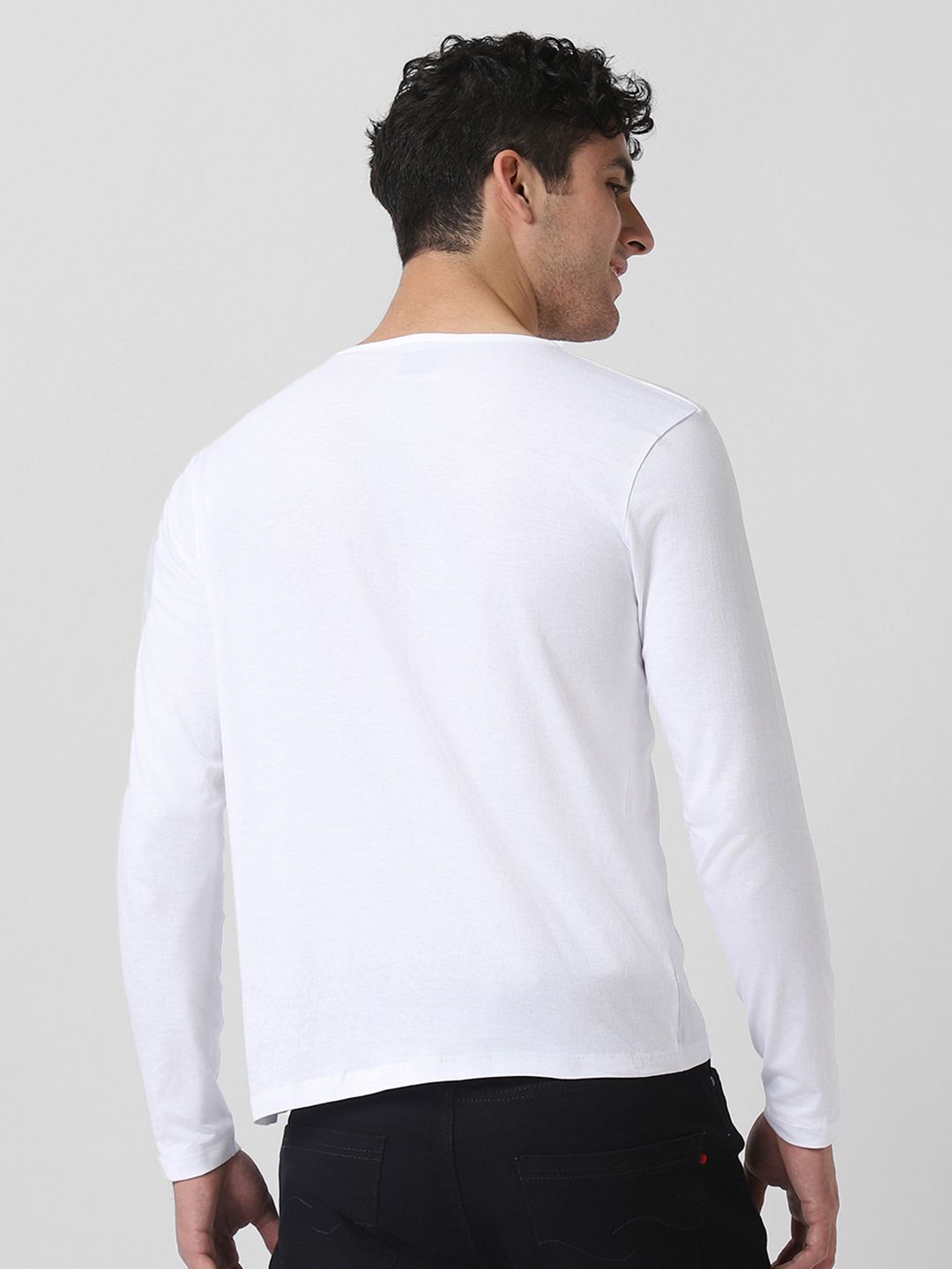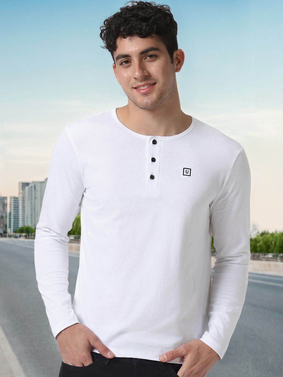 White solid T-shirt, has a Henley neck, and long sleeves
