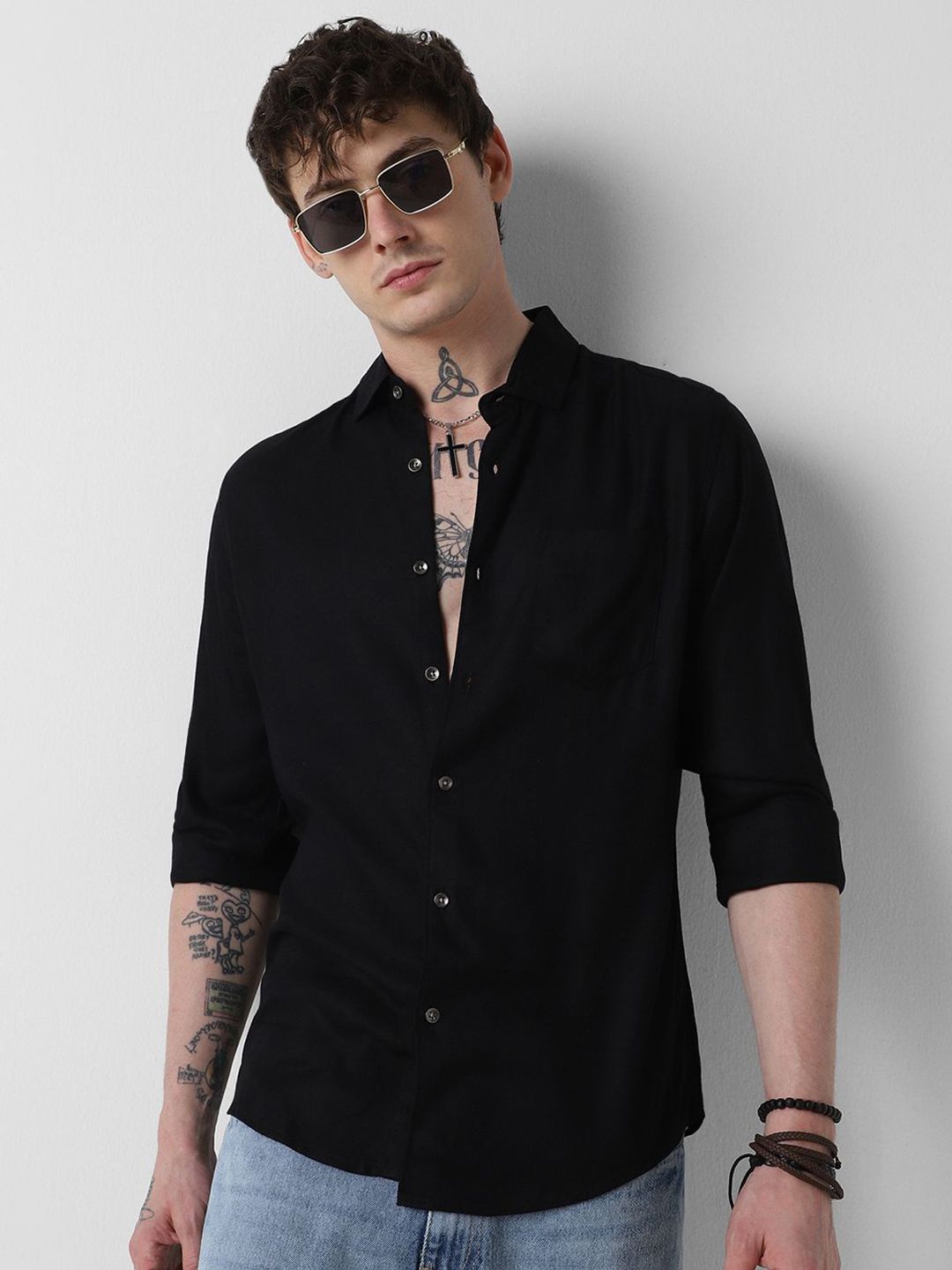 Black solid opaque casual shirt, has a spread collar, button placket, 1 patch pocket, long regular sleeves, curved hem