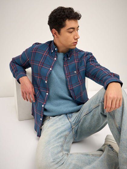 THE BEAR HOUSE Men Blue Flannel Slim Fit Pure Cotton Checked Casual Shirt