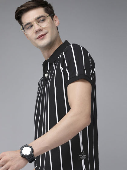 THE BEAR HOUSE Men Black & White Striped Yarndyed Polo Collar Slim Fit T-shirt