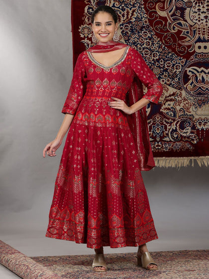 AURELIA Printed Ethnic Motifs Satin Maxi Ethnic Dress