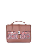 Brown & pink geometric printed satchel 1 main compartment, has a twist closure, 1 external pocket, 2 inner pockets