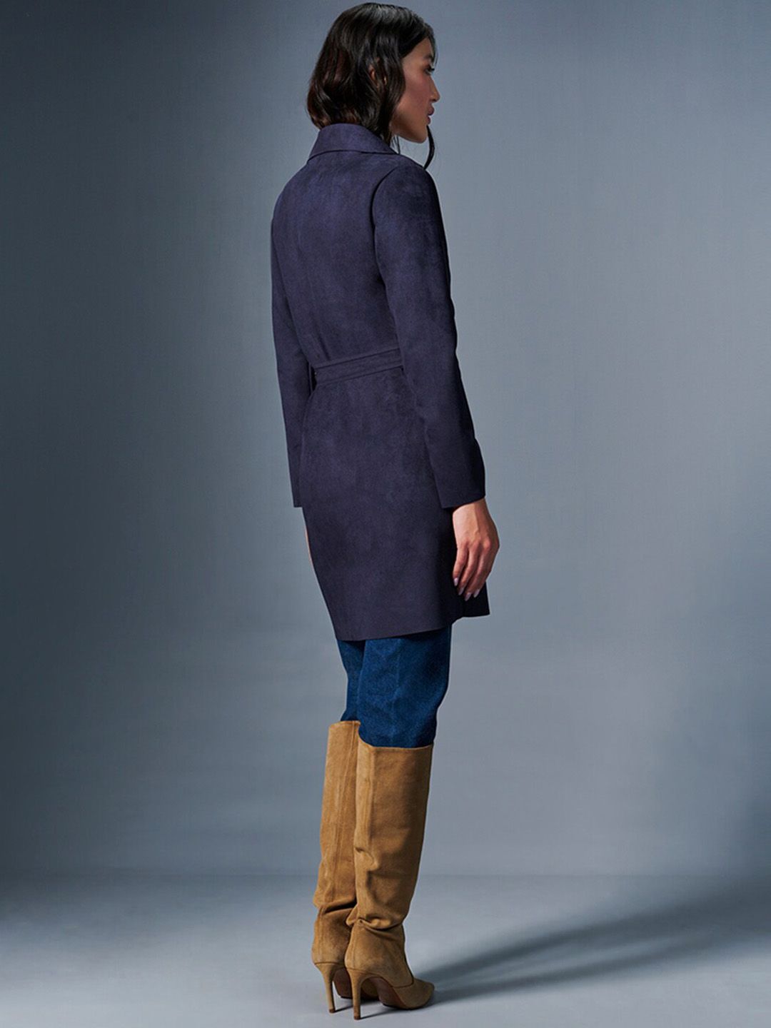 Navy blue solid tailored jacket, has a stand collar, 2 pockets ,has a tie-up closure, long sleeves, straight hemline, polyester lining