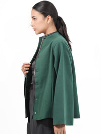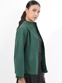 Green solid tailored jacket, has a stand collar, 2 pockets, long sleeves, straight hemline, polyester lining