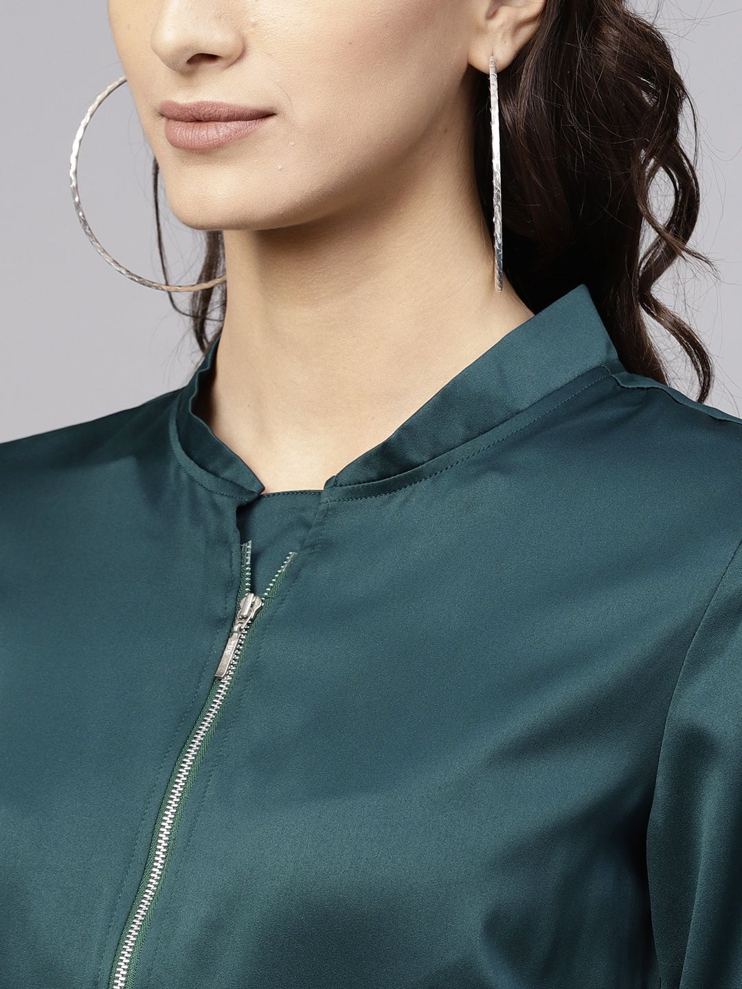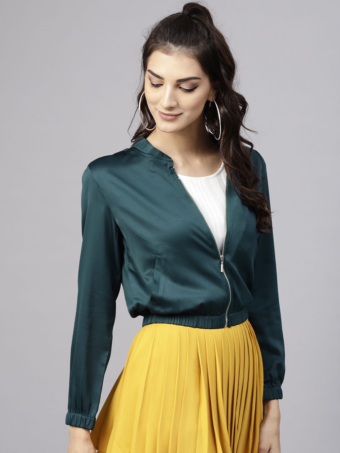 STREET 9 Women Teal Green Solid Satin Cropped Bomber Jacket